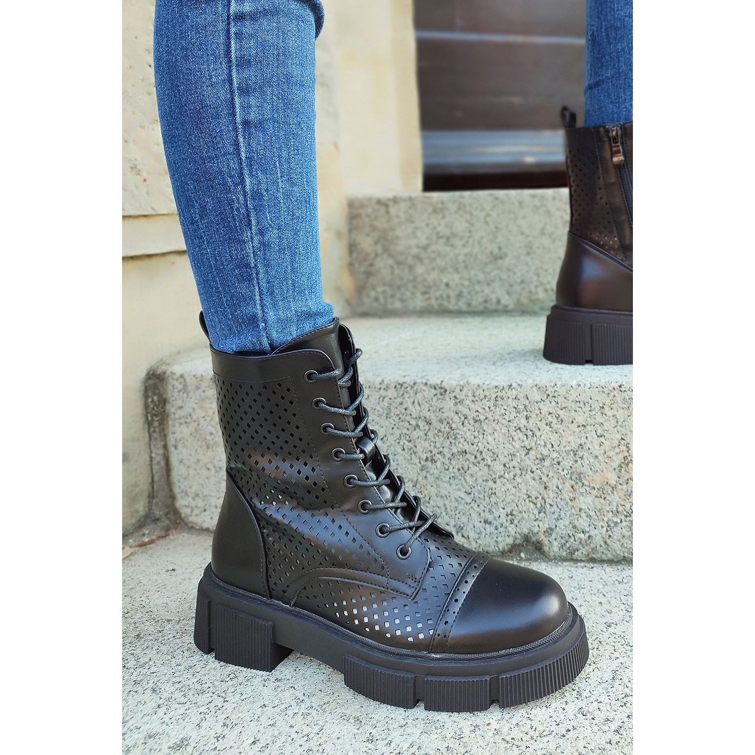 Pojedinosti: Ženske ažurne crne čizme na vezanje crna