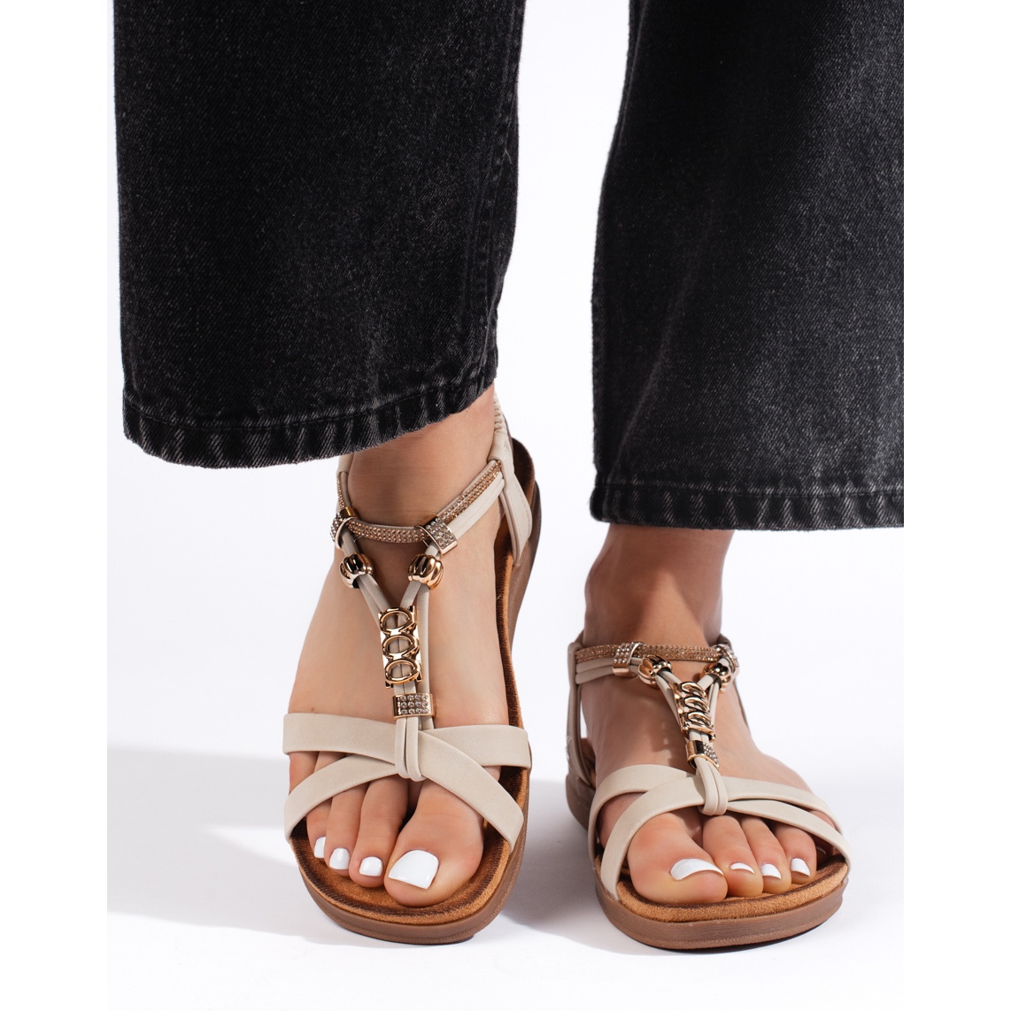 Ravna peta s visinom od 3 cm čini sandale ugodnim cijeli dan, a glatki plastični potplat osigurava stabilnost i izdržljivost. Ponuđena bež boja ide savršeno s drugim nijansama, što ih čini svestranim elementom garderobe.