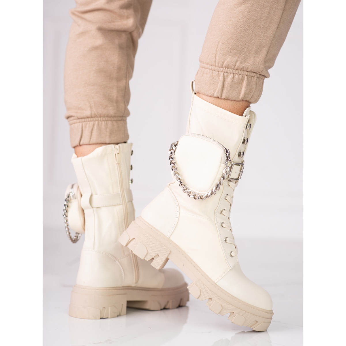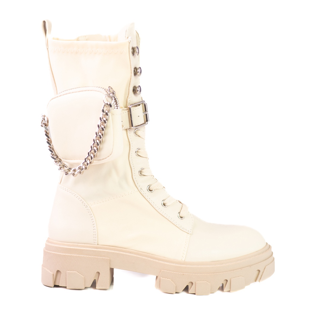 Bež boja i minimalistički dizajn čine da ove gležnjače savršeno pristaju uz različite stilove - od ležernog do elegantnijeg. Zatvarač, kopča i vezanje omogućavaju savršeno pristajanje uz nogu, a dodatni element u obliku lančića daje im originalan karakter.