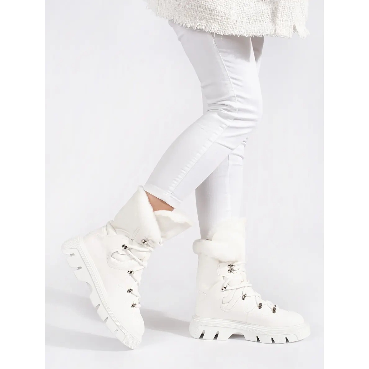 Snježne čizme izrađene su od visokokvalitetne ekološke kože s elementima imitacije antilop, zahvaljujući koje izgledaju vrlo elegantno. Njihove bijele boje lako se uklapaju u svaku zimsku stilizaciju, a krzno dodaje ne samo osjećaje topline, već i modni naglasak.