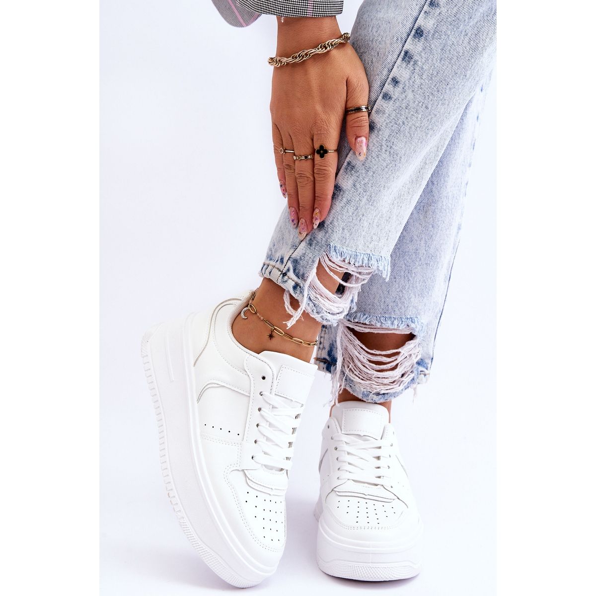 Otkrijte udobnost i stil na svakom koraku uz ženske sportske cipele s visokom platformom marke FB2. Ove elegantne, bijele cipele odlikuje se ne samo modernim dizajnom, već i pažljivom izradom od visokokvalitetne eko-kože koja osigurava izdržljivost i udobnost korištenja. Delikatna perforacija na prednjoj strani daje lakoću i prozračnost.