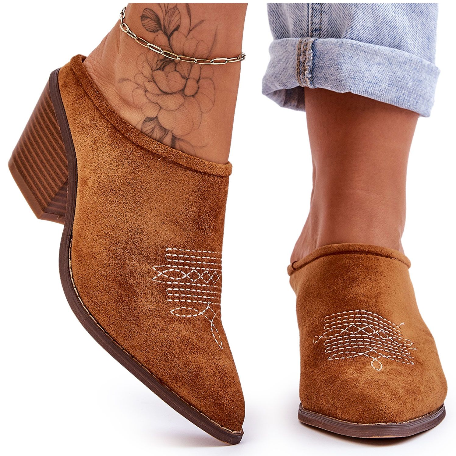 Predstavljamo BM kaubojske sandale u camel nijansi koje savršeno nadopunjuju svaki casual stajling! Izrađene od visokokvalitetnog eko antilop kože, izgledaju iznimno elegantno zahvaljujući izvezenom uzorku na prednjoj strani. Klasični šiljati vrh i masivna blok peta od 6,5 cm čine ovaj model ne samo elegantnim, već i vrlo udobnim.