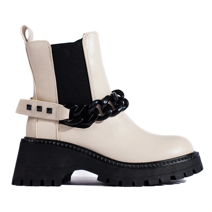 Elegantne i univerzalne ženske čizme Chelseaja koje kombiniraju ležerni stil s praktičnim rješenjima za hladnije dane. Izrađena od ekološke kože u prigušenoj bež boje s crnim naglascima i ukrasnim lancem, idealnim za stilizirane jesenske zime.