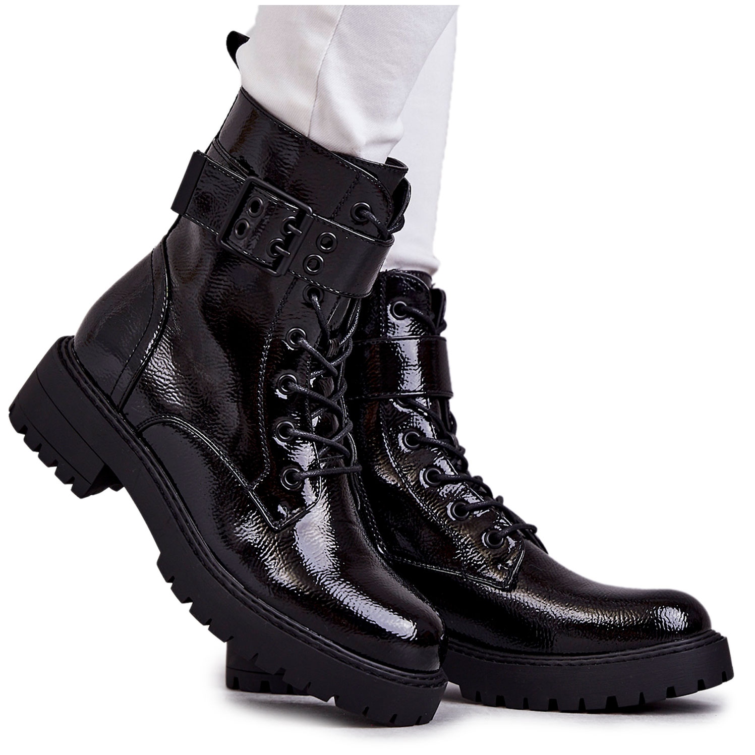 PJ1 Ženske čizme lakirane na vezanje na ravnu petu crne Firmine crna