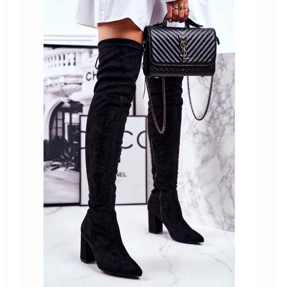 Ove čizme imaju šiljati vrh koji dodaje stil, a kopčanje na vezanje omogućuje savršeno pristajanje uz nogu. Visina gornjeg dijela je 60 cm, a potpetica u obliku bloka visoka je 8 cm, što jamči udobnost nošenja tijekom cijelog dana.