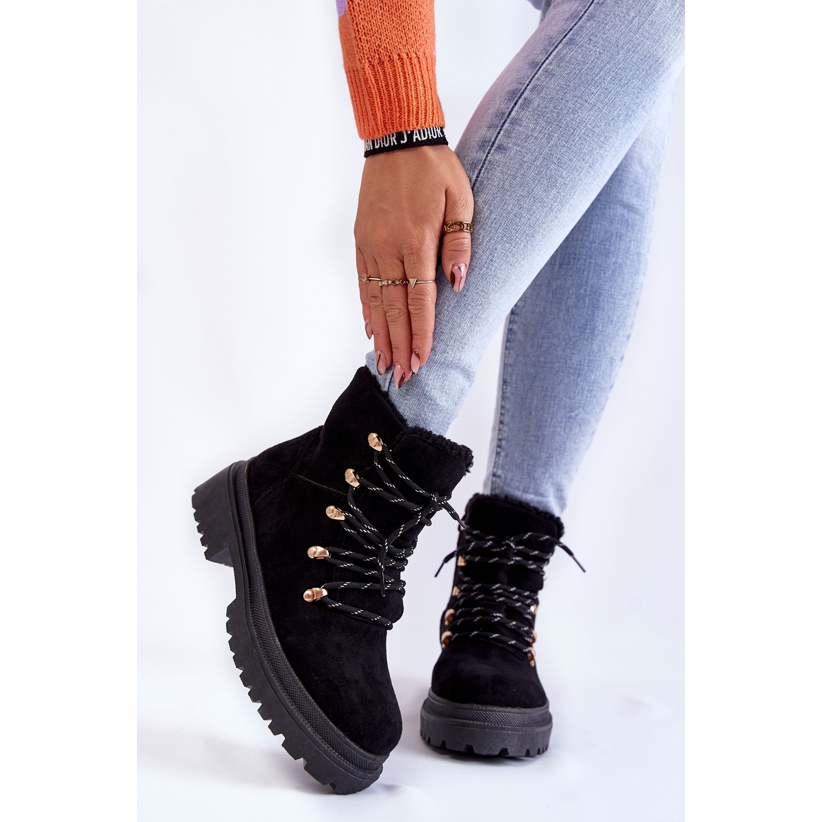 Unutrašnjost čizama izolirana je udobnom dekom za obuću, a kraj gornjeg dijela ukrašen je kožuhom ugodnim na dodir, koji osigurava maksimalnu udobnost i toplinu. Čizme su postavljene na ravnu petu i platformu s utorima, što pozitivno utječe na stabilnost i sigurnost pri hodu. Dodatno, peta je malo ukrućena, što daje bolju potporu stopalu.