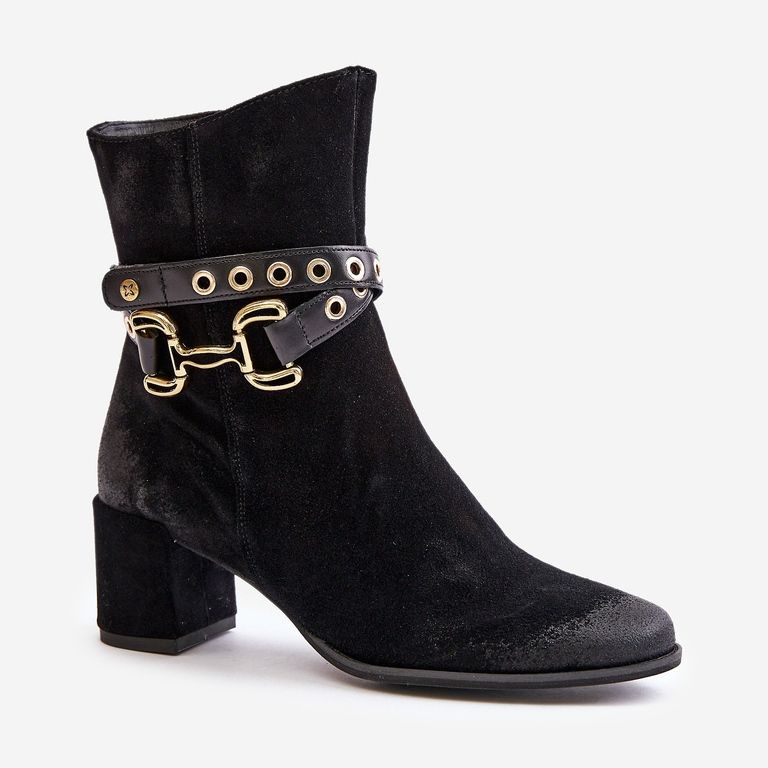 Ženske čizme od brušene kože na visoku petu s ukrasnim remenom Maciejka 06679-01 Crne crna
