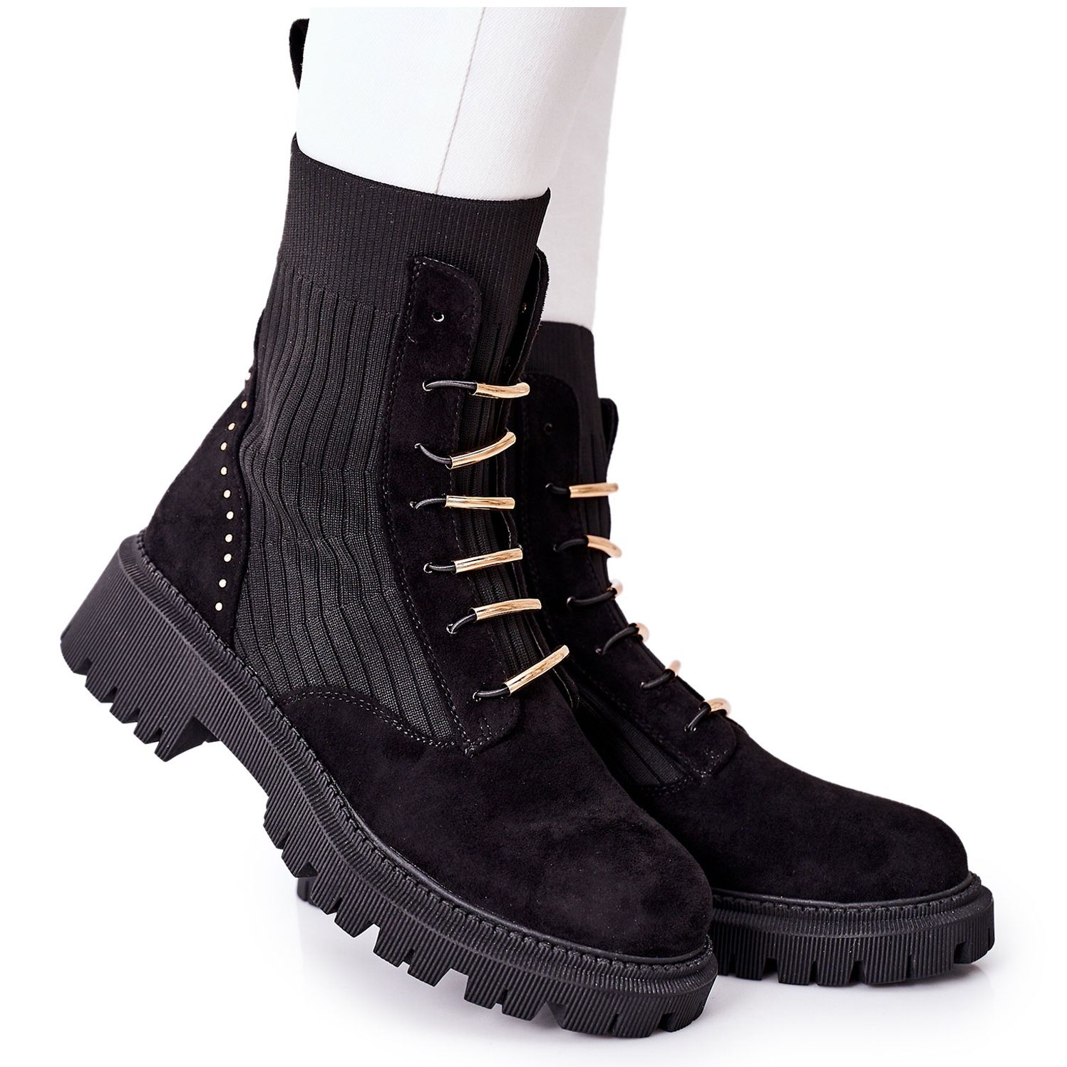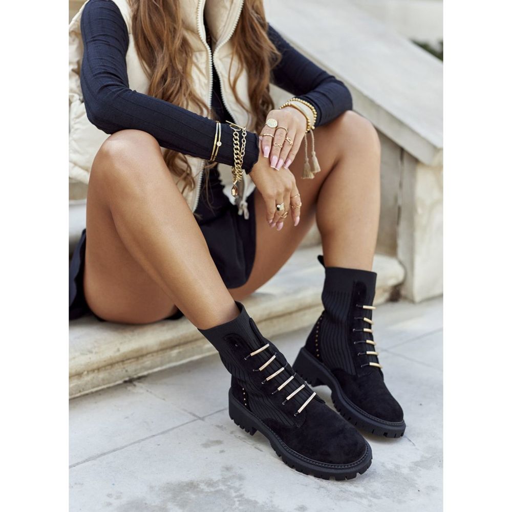 Visoki gornji dio u obliku čarape, s izvrsnom rastezljivošću, čini obuvanje izuzetno lakim, a istovremeno osigurava savršeno pristajanje na potkoljenicu. Zlatni dodaci suptilno naglašavaju njihov jedinstveni stil, čineći ih iznimno elegantnima i modernima.