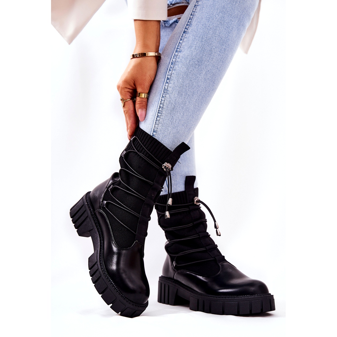 Basido čizme s basido čarapom - crnom, elegantnom i udobnom. Kombinacija masivnog, modernog potplata s mekim gornjim dijelom čarape daje učinak sirovog i ženstvenog izgleda. Savršeno za hladnije dane zahvaljujući nježnom zagrijavanju u obliku krzna.