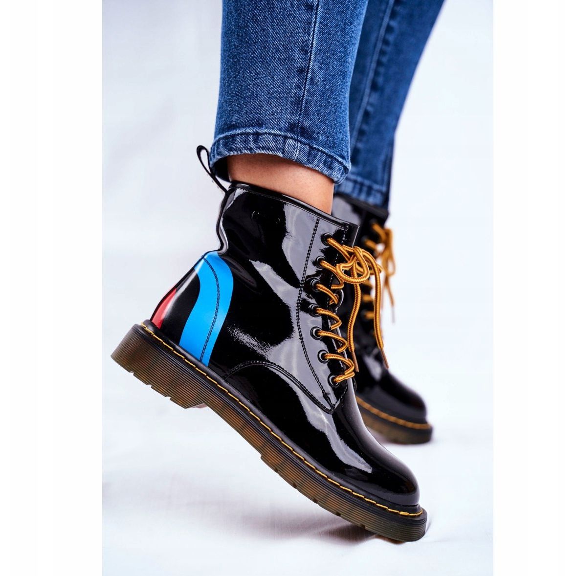 Izrađene od najkvalitetnije lakirane kože, čizme nisu samo izdržljive, već su i elegantne i privlačne. Otmjeni print oko pete dodaje karakter, a žuti šavovi na potplatu i vezice u savršenom su kontrastu s dubokom crnom bojom, stvarajući privlačnu cjelinu.