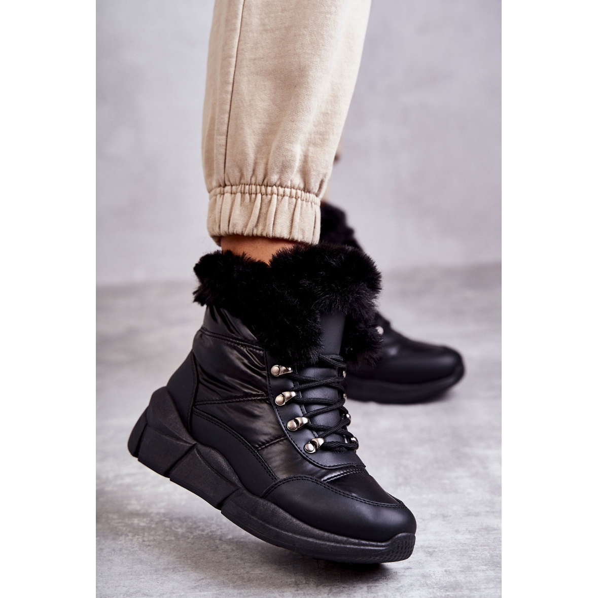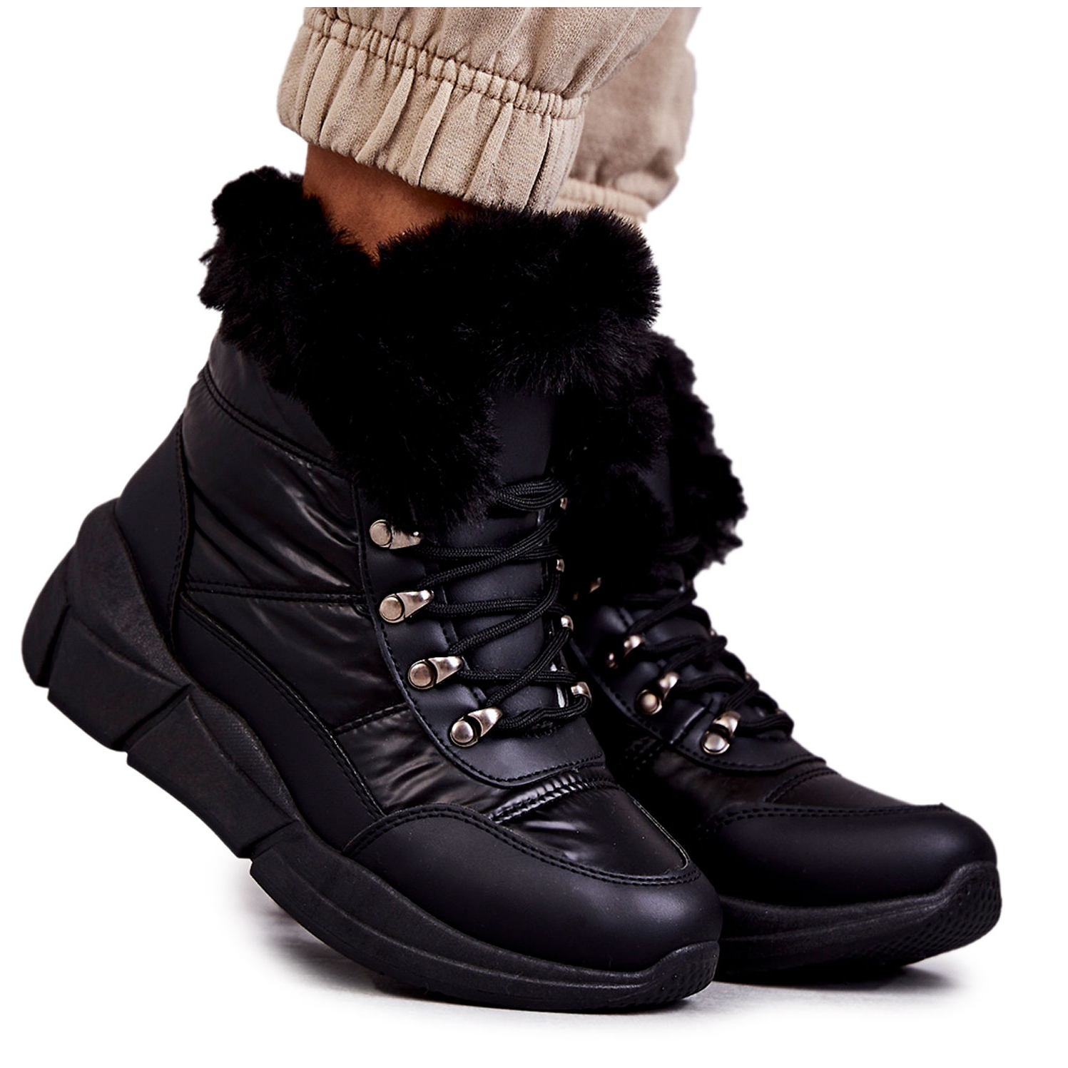 Gornji dio doseže 13 cm, završen mekim, umjetnim krznom, dodaje elegantan karakter, a klasično vezivanje omogućuje savršeno pristajanje uz nogu. Masivna platforma visine 4 cm čini hodanje u ovim čizmama za snijeg čistim užitkom, a istovremeno vizualno izdužuje noge.