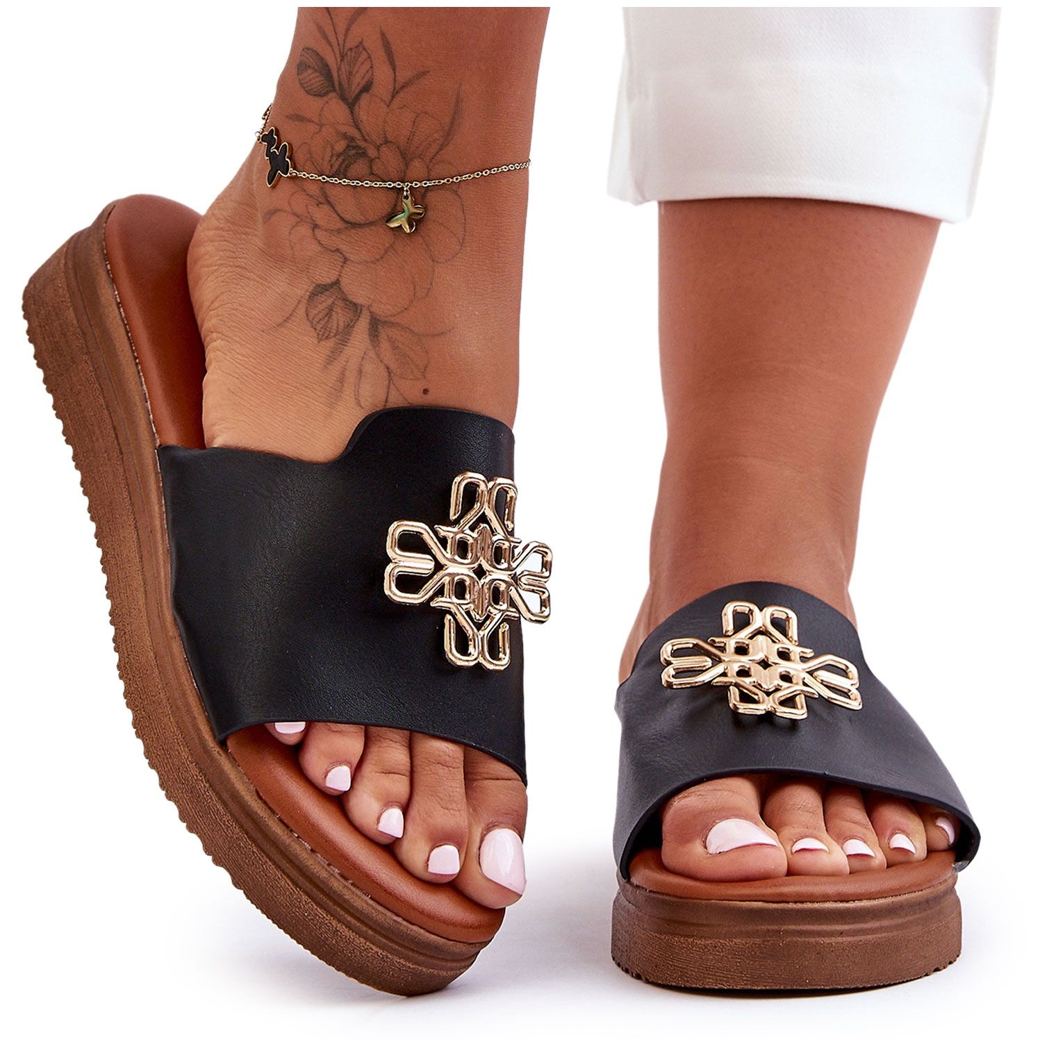 Pojedinosti: PG1 Ženske crne Azera papuče s platformom i ukrasom crna