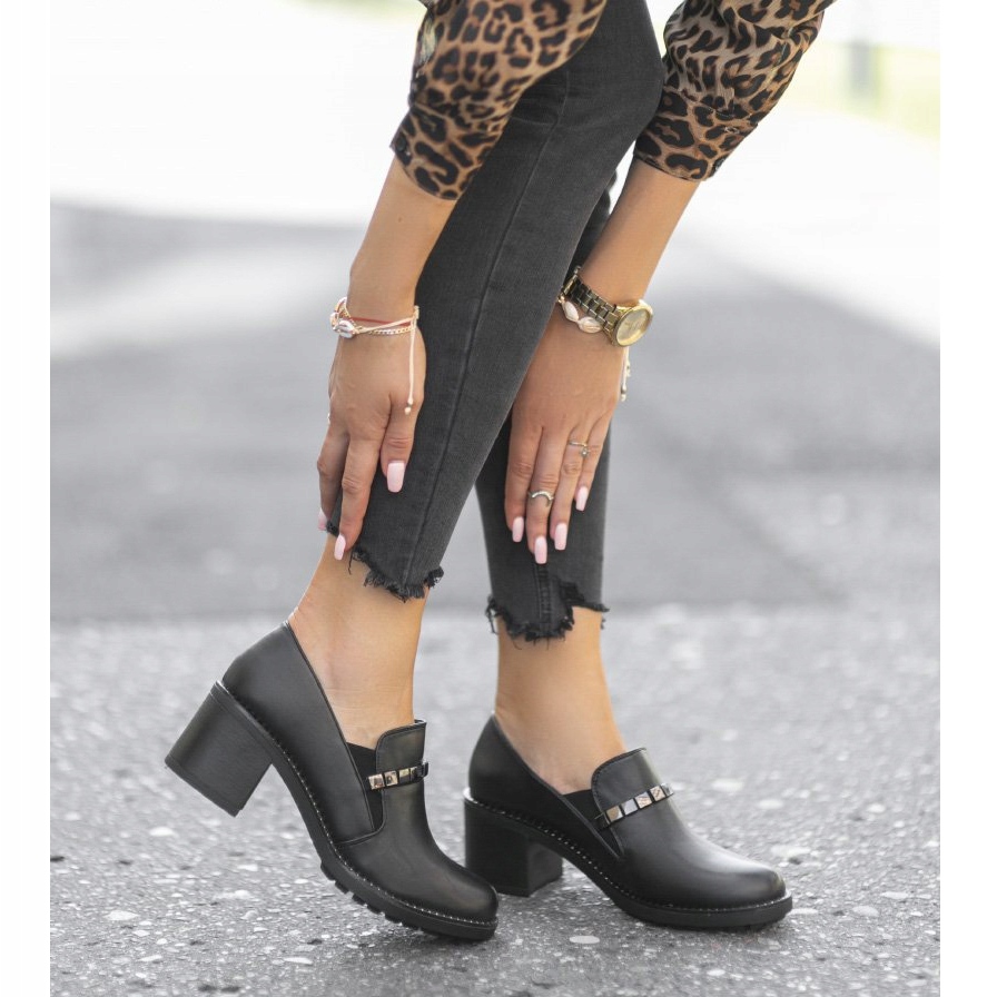 Crni gornji dio obogaćen je suptilnom elastičnom trakom s ukrasnim metalom, što ne samo da povećava udobnost nošenja, već utječe i na originalnost modela. Okrugli vrh i udobna potpetica visine 6,5 cm čine obuću ne samo elegantnom, već i udobnom, čak i nakon dužeg korištenja.