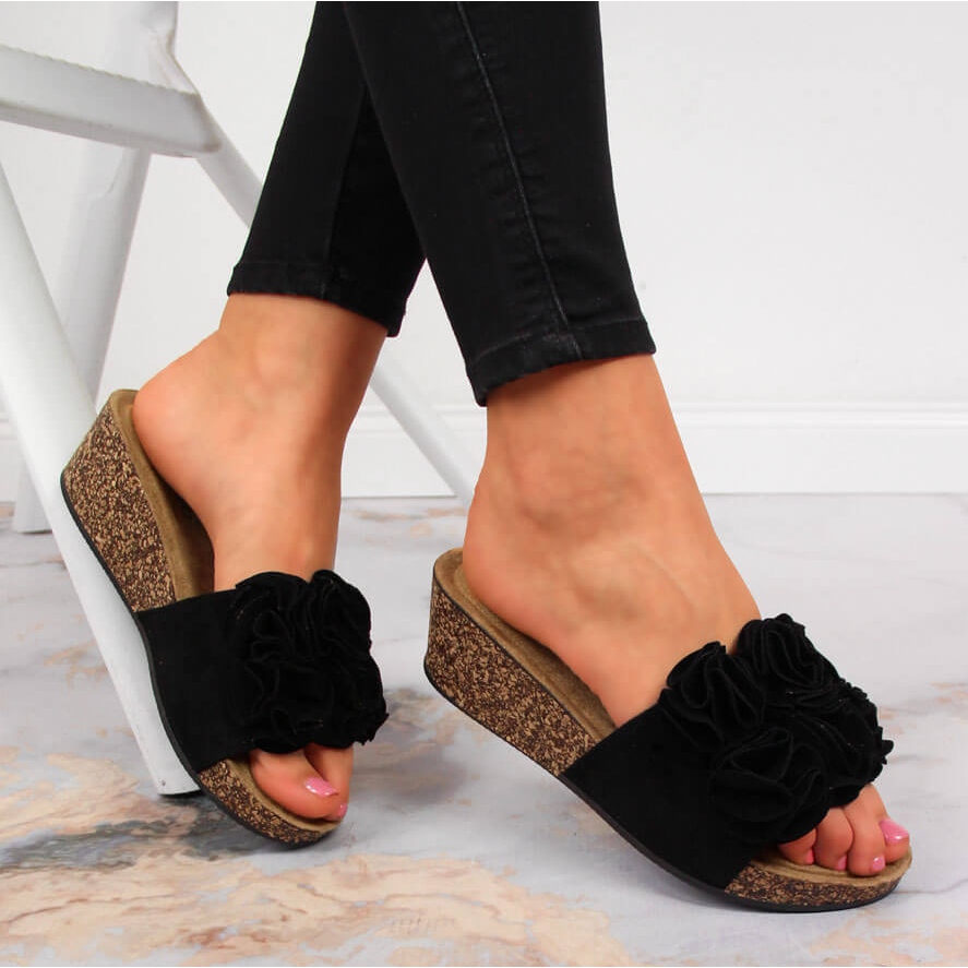 Pojedinosti: Ženske crne papuče na klin s cvijećem eVento crna
