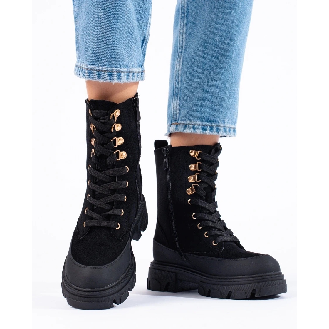 Moderni radnici W. Potocki kombiniraju stijenski lik s svakodnevnom udobnošću. Napravljeni od ekološke antilop u klasičnoj crnoj boji, savršeno se podudaraju s jesenskom stilu - izolirane su i opremljene mekim pokrivačem obuće, zahvaljujući koje pružaju toplinu i udobnost čak i na niskim temperaturama.
