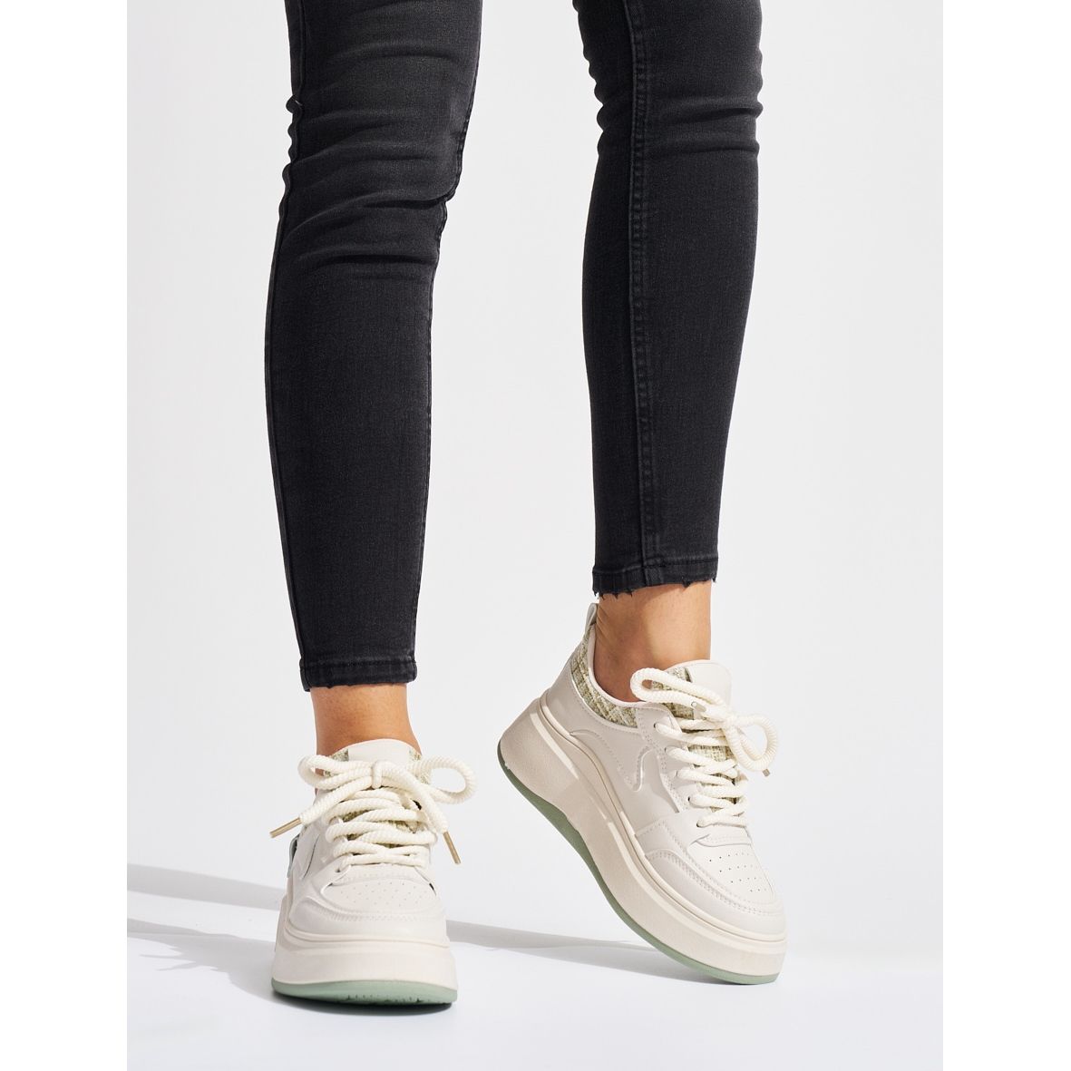 Ovaj model iznenađuje širokim đonom visine 4 cm od visokokvalitetne gume. Zahvaljujući gazištu, tenisice nisu samo estetske, već i praktične - pružaju dobro prianjanje na raznim podlogama.