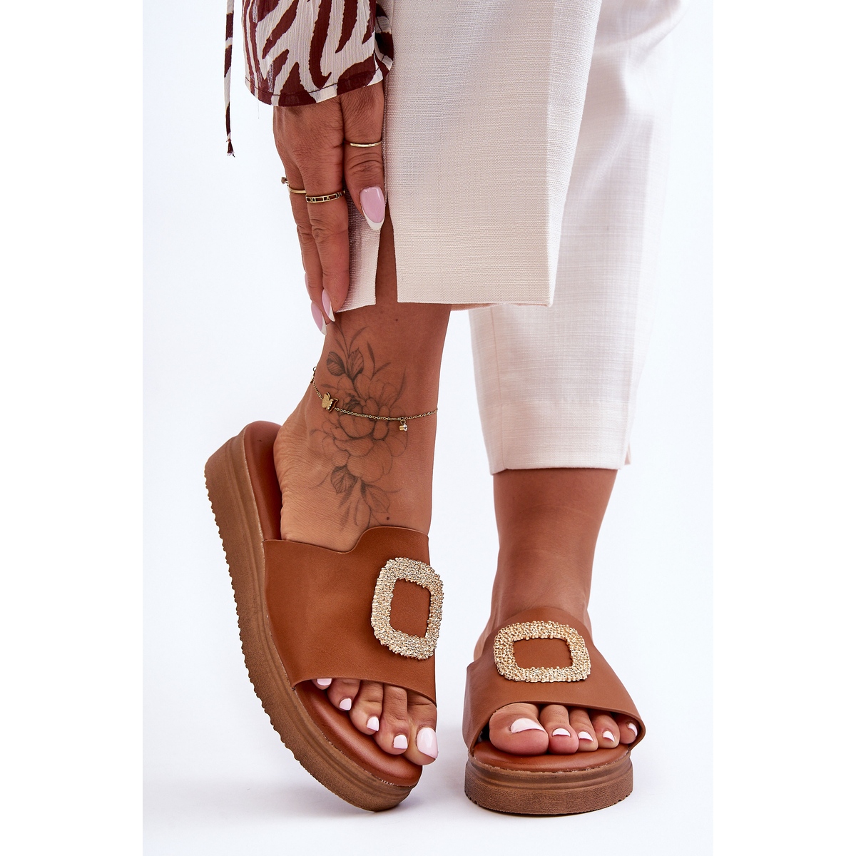 Velika aplikacija od nakita na prednjoj strani japanki privlači pozornost dajući im jedinstven karakter. Zahvaljujući mekom umetku, japanke su udobne za nošenje tijekom cijelog dana, što ih čini idealnim izborom za ljetne šetnje, izlete na plažu ili ležerne susrete s prijateljima.