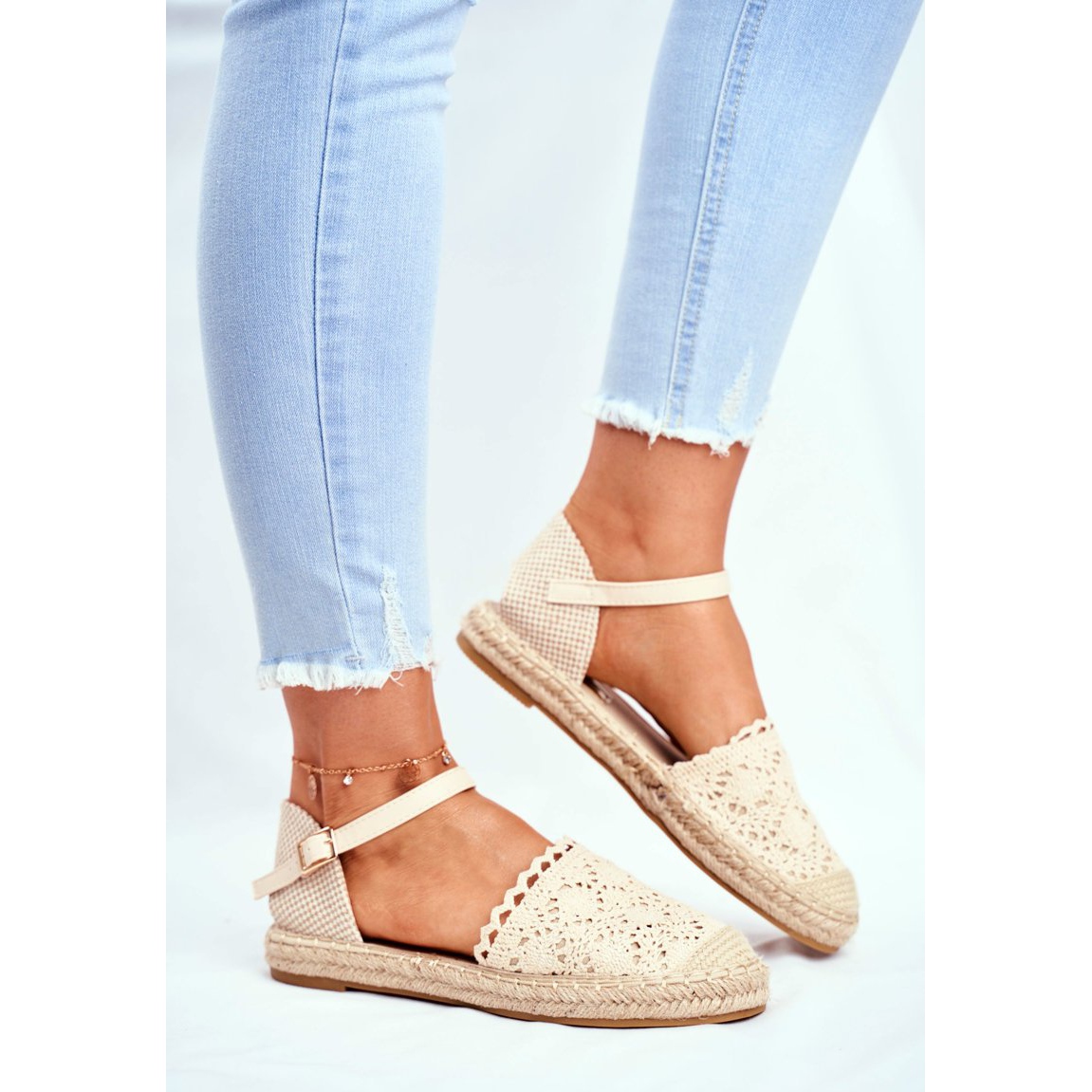 Dekoracija uzica oko potplata daje im stilsku prednost, a završetak čipke na prstima dodaje dašak jedinstvenog, ljetnog šika. Klasični remen oko gležnja ne samo da naglašava oblik stopala, već omogućuje savršeno pristajanje.