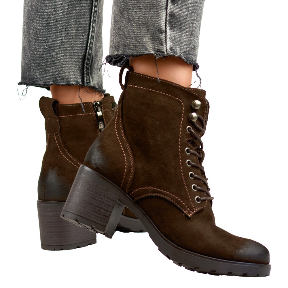 Detalji: Ženske gležnjače od brušene kože smeđe na vezanje smeđa