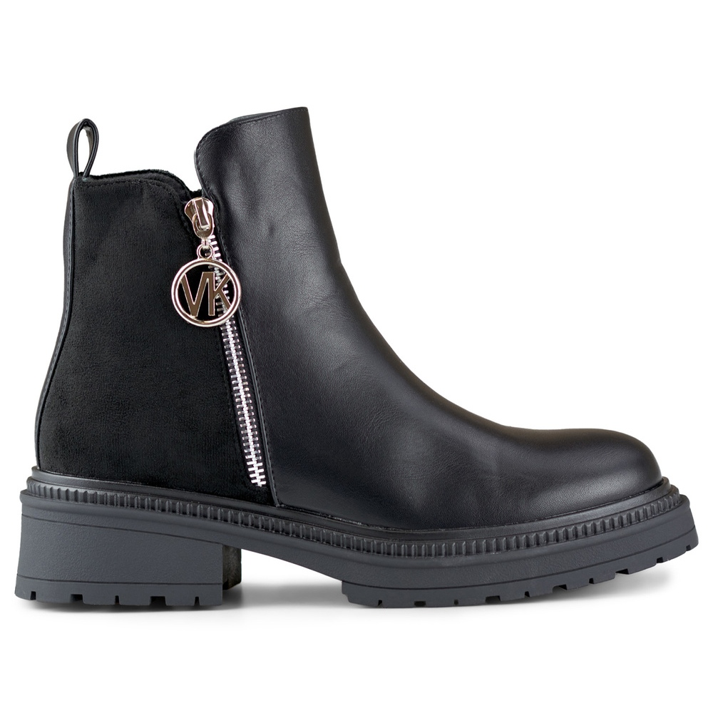 Elegantne, crne čizme gležnja s ukrasnom bravom, kombinirajući moderan izgled s funkcionalnošću. Izrađena od ekološke kože s elementima ekološke antilop, izolirana s krznom umetkom - savršeno za hladnije dane. Stabilna platforma od 2,5 cm pruža prikladnu podršku uz održavanje ženskog profila.