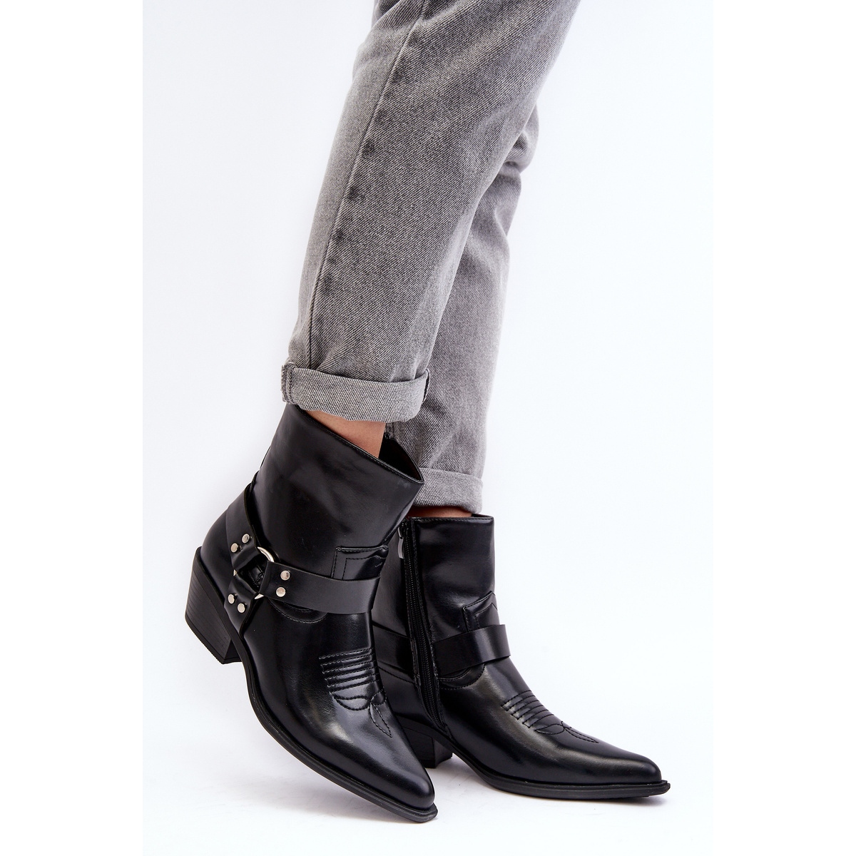 Moderne kaubojske čizme koje svakodnevno kombiniraju modni izgled s udobnošću. Izrađena od ekološke kože, postavljena na niskoj petici od 5 cm - savršeno ako tražite cipele gležnja koje optički mršaju lik zahvaljujući šiljanom nožnom prstu. Gornji (visok 15 cm) ukrašeni ubodom, povezanim prugama i detaljima kao što su rhinestones i vez, daje karakter bilo koje stilizacije. Agent izoliran s mekom pokrivačem obuće - savršeno za hladnije dane. ZIP pričvršćivač olakšava umetanje, a plastični potplat trajno osigurava stabilnost.