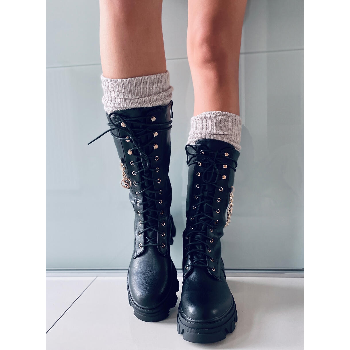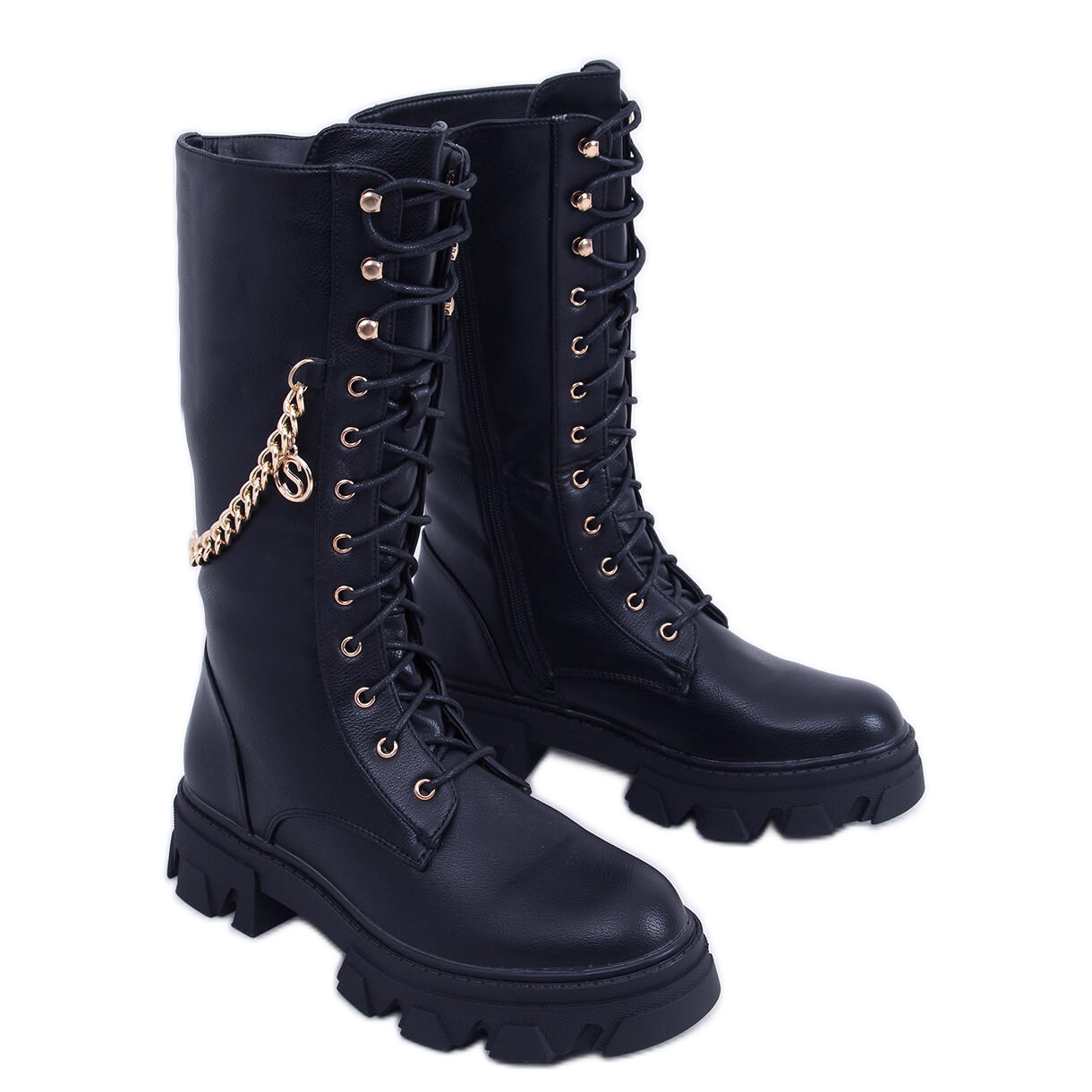 Predstavljamo vam BM Totah Black ženske čizme - idealan prijedlog za žene koje žele spojiti moderan dizajn s udobnošću nošenja. Ove čizme na vezanje s visokim potplatom odlikuju se ne samo modernim krojem, već i elegantnim zlatnim lancem koji im daje eleganciju i karakter.