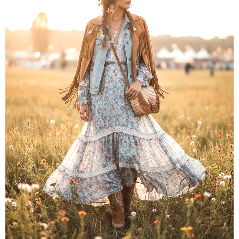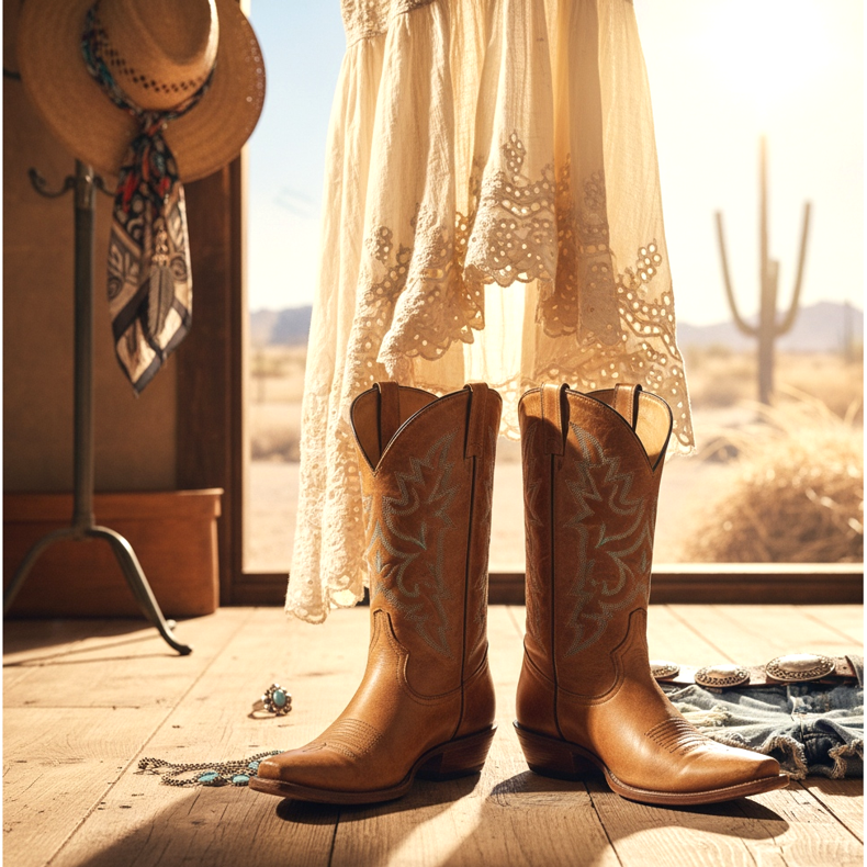 Najbolji pratilac kaubojskim čizmama je prozračna haljina u boho stilu. Odaberite model s cvjetićima, volanima ili čipkom. Kontrast između teške kožne cipele i nježnog materijala haljine stvara iznimno stilski efekt. Dodajte jaknu od brušene kože s resama ili traper katanu i spremni ste za festival ili spoj.