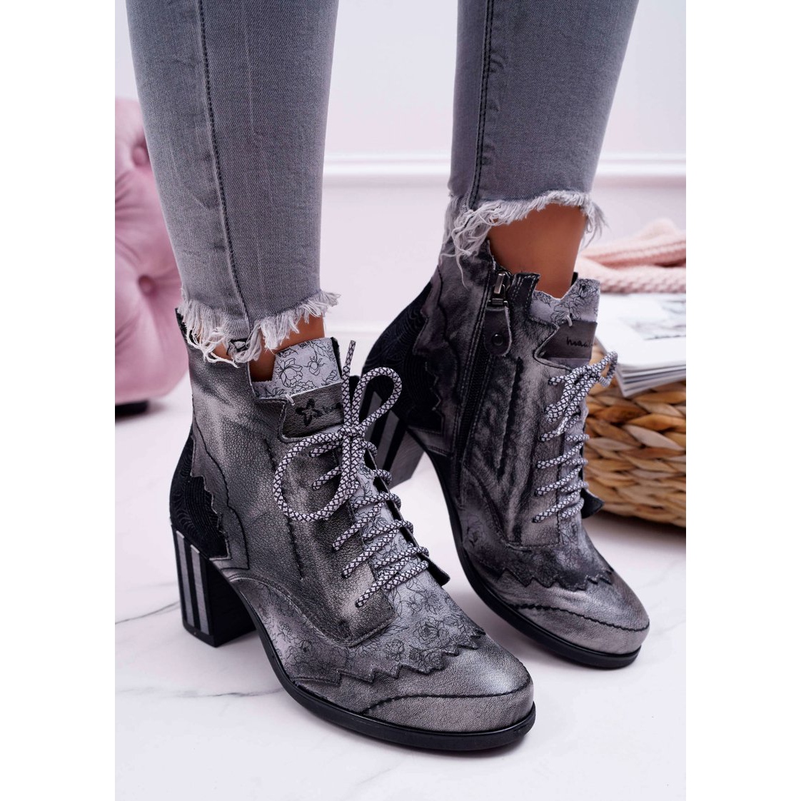 Ovaj model ima izolirani umetak, koji osigurava udobnost i toplinu u hladnijim danima. Zahvaljujući visokoj peti od 7,5 cm i praktičnoj vrsti kopče, ova obuća je udobna i stabilna. Gornja visina od 12 cm pruža ne samo odgovarajuću potporu, već i moderan izgled.