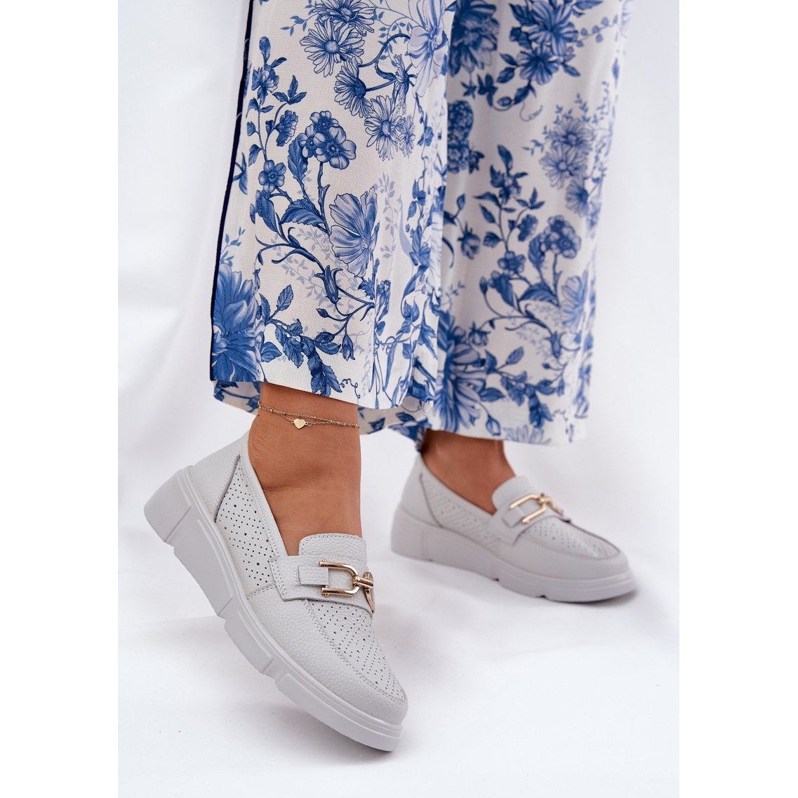Ženske kožne lovke sa zlatnim detaljima Vinceza 88007 u svijetlosivo i bijeloj je savršena kombinacija elegancije i udobnosti, koja će zasigurno nadopuniti svaku žensku garderobu. Napravljene od visokokvalitetne prirodne kože, ove cipele karakteriziraju osjetljivi 4,5 cm visoki klin, što svaki dan dodaje stil i udobnost.