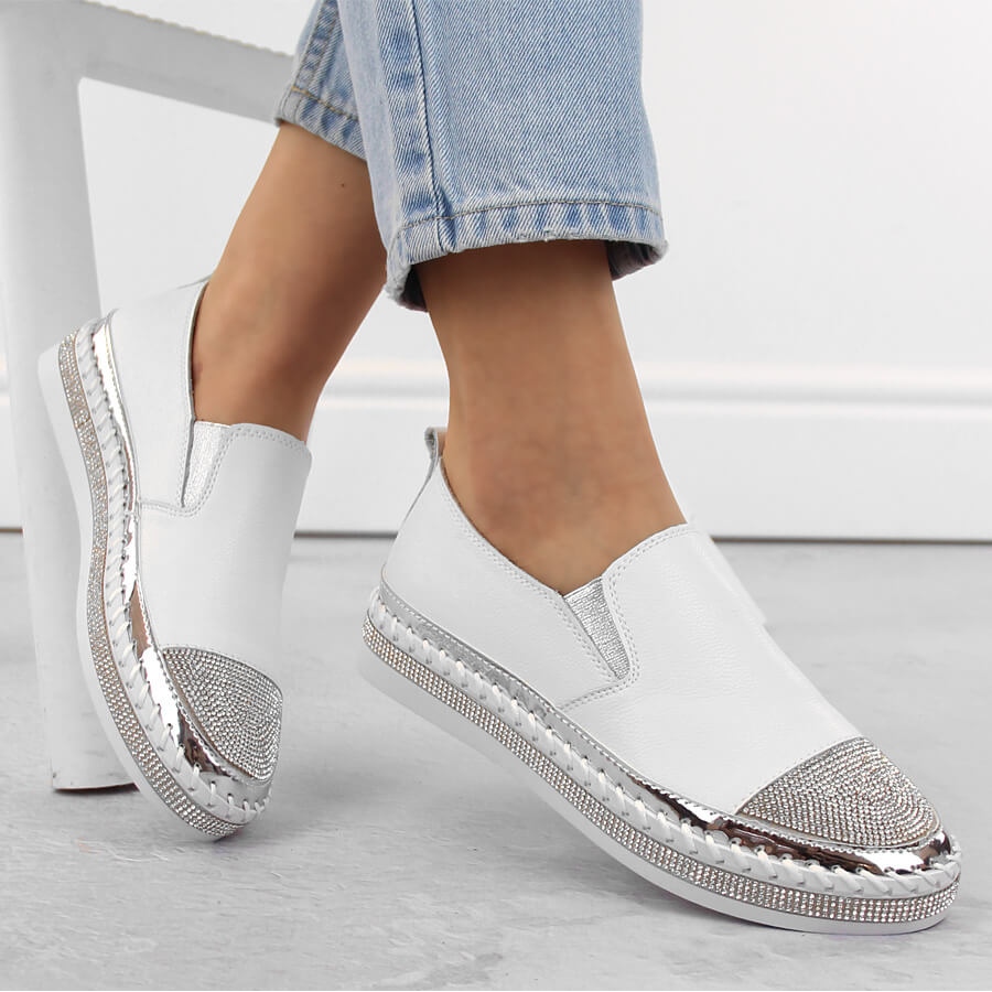Predstavljamo savršene ženske cipele koje spajaju eleganciju i udobnost - model S.Barski izrađen od visokokvalitetne prirodne kože i ukrašen nježnim cirkonima. Ove bijele natikače brenda D&A savršen su izbor za svako godišnje doba, savršene za proljeće, ljeto i ranu jesen.