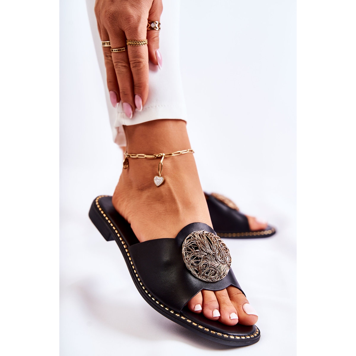 Colene japanke su postavljene na 1 cm visoku ravnu petu što ih čini izuzetno stabilnim. Njihov zaobljeni vrh i dizajn slip-on čine ih pravim zadovoljstvom nositi. Japanke su dostupne u klasičnoj crnoj boji, što omogućuje jednostavno uklapanje uz različite stilove.