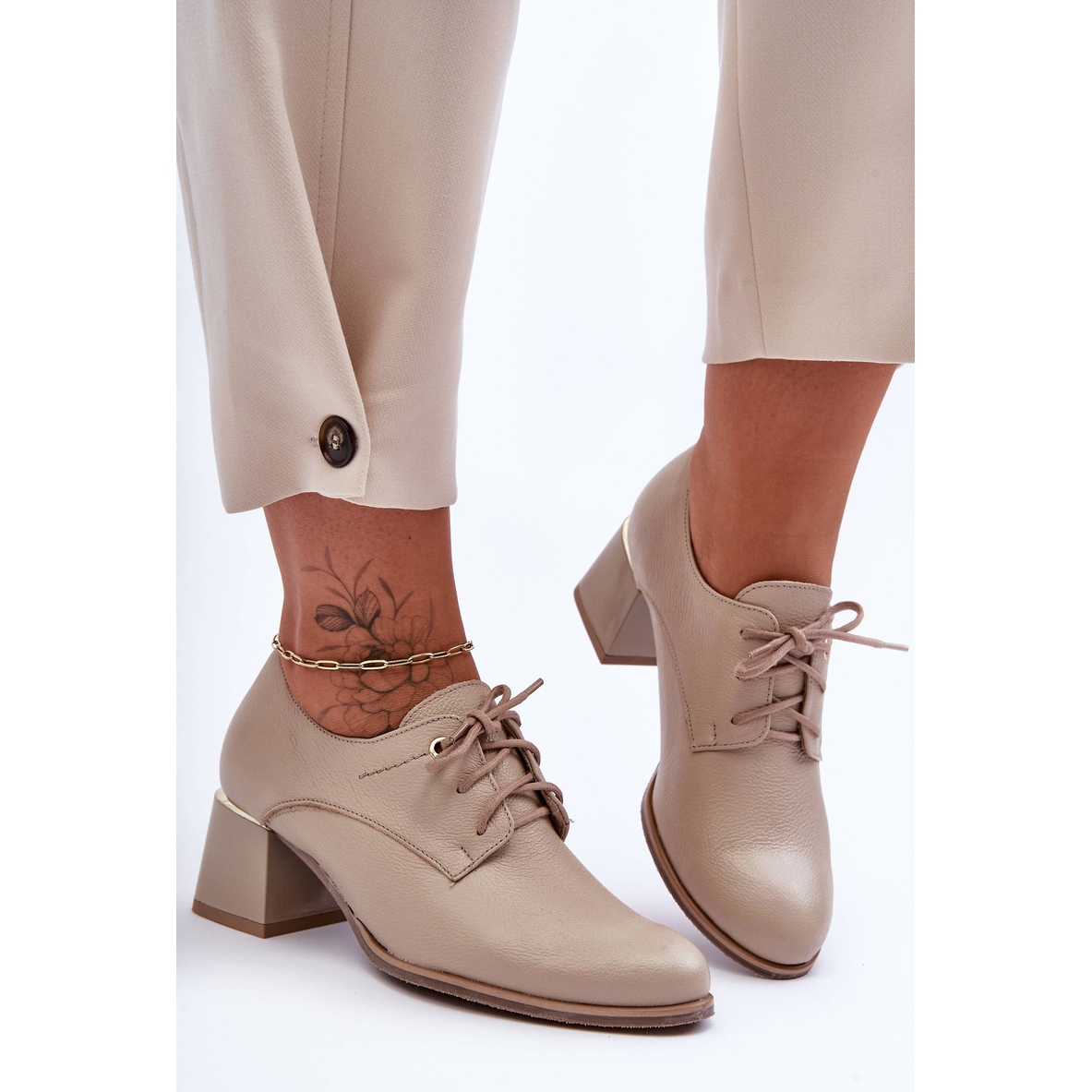 Cipele su postavljene na stabilnu petu visine 5,5 cm, što daje eleganciju i stanji figuru, a osigurava udobnost. Bež boja je izrazito univerzalna i odlično pristaje uz razne odjevne kombinacije, od traperica do haljina.