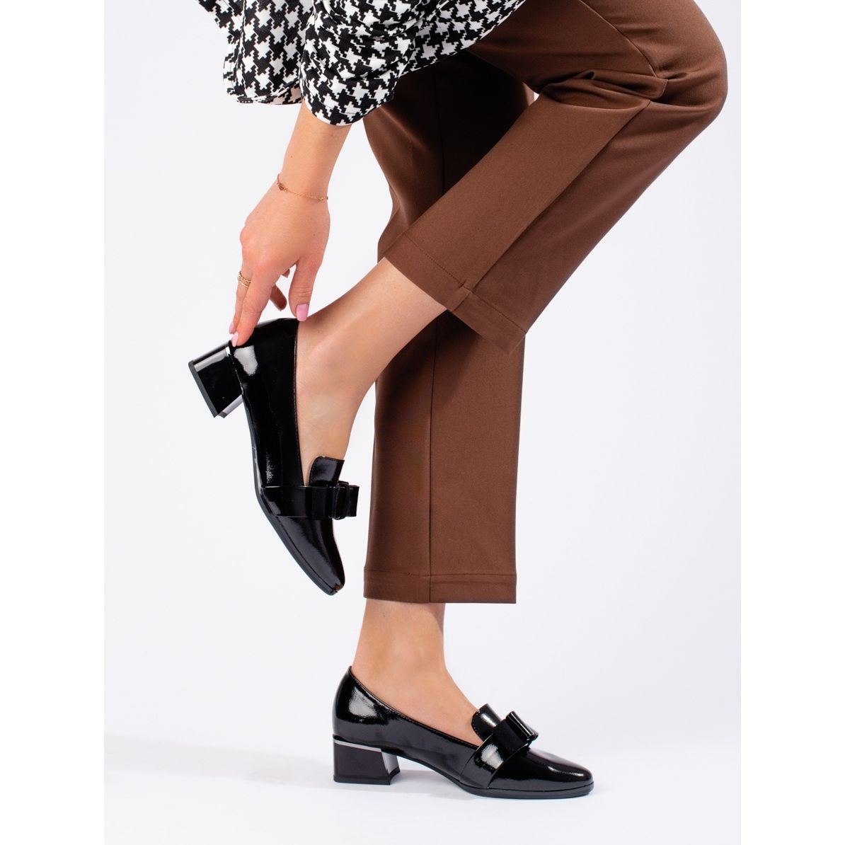 Predstavljamo lakirane ženske cipele na visoku petu s mašnom u elegantnoj crnoj boji proizvođača Vinceza. Ove elegantne cipele savršen su izbor za svakodnevne i svečane prilike, kombinirajući ležeran stil s daškom šika.