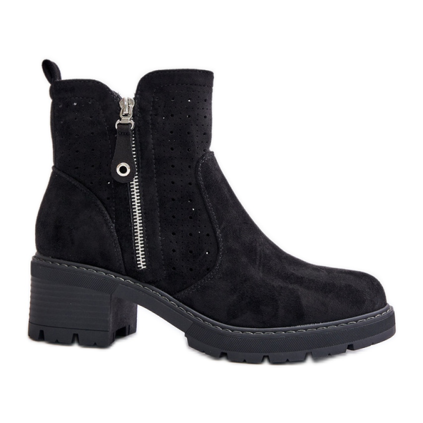 Stabilna, niska peta s visinom od 5 cm omogućava vam da se udobno nosite tijekom dana, a okrugli nos dodatno naglašava njihov ženski karakter. Zahvaljujući praktičnom pričvršćivanju patentnih zatvarača, stavljanju i skidanju čizama je brzo i jednostavno. Unutrašnjost je izolirana tkaninom, što ih čini idealnim rješenjem za hladnije dane.