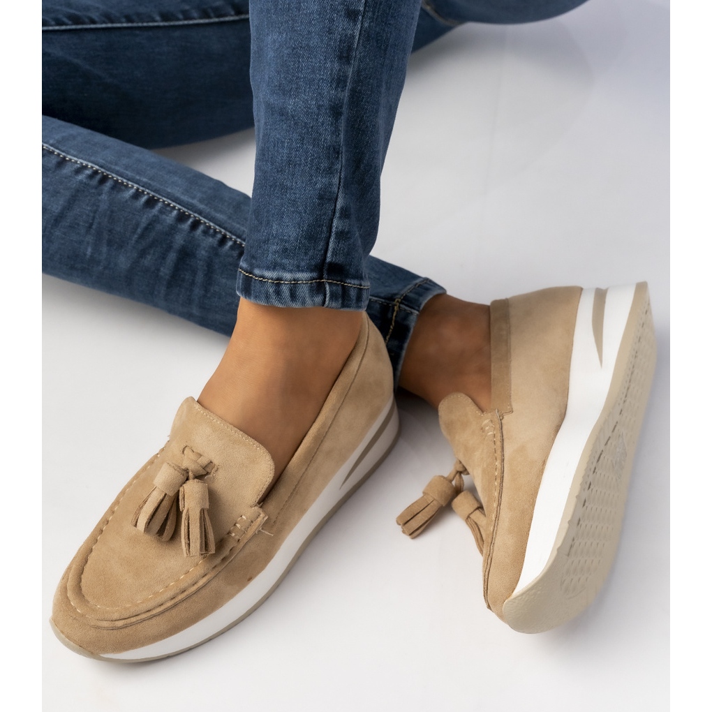 Otkrijte eleganciju i utjehu u obliku ženskih mokasina s budalima u suptilnoj bež nijansi. Ove jedinstvene lomace na platformi pažljivo su izrađene od visokokvalitetne antilop, koji pruža ne samo prekrasan izgled, već i udobnost nošenja cijeli dan.