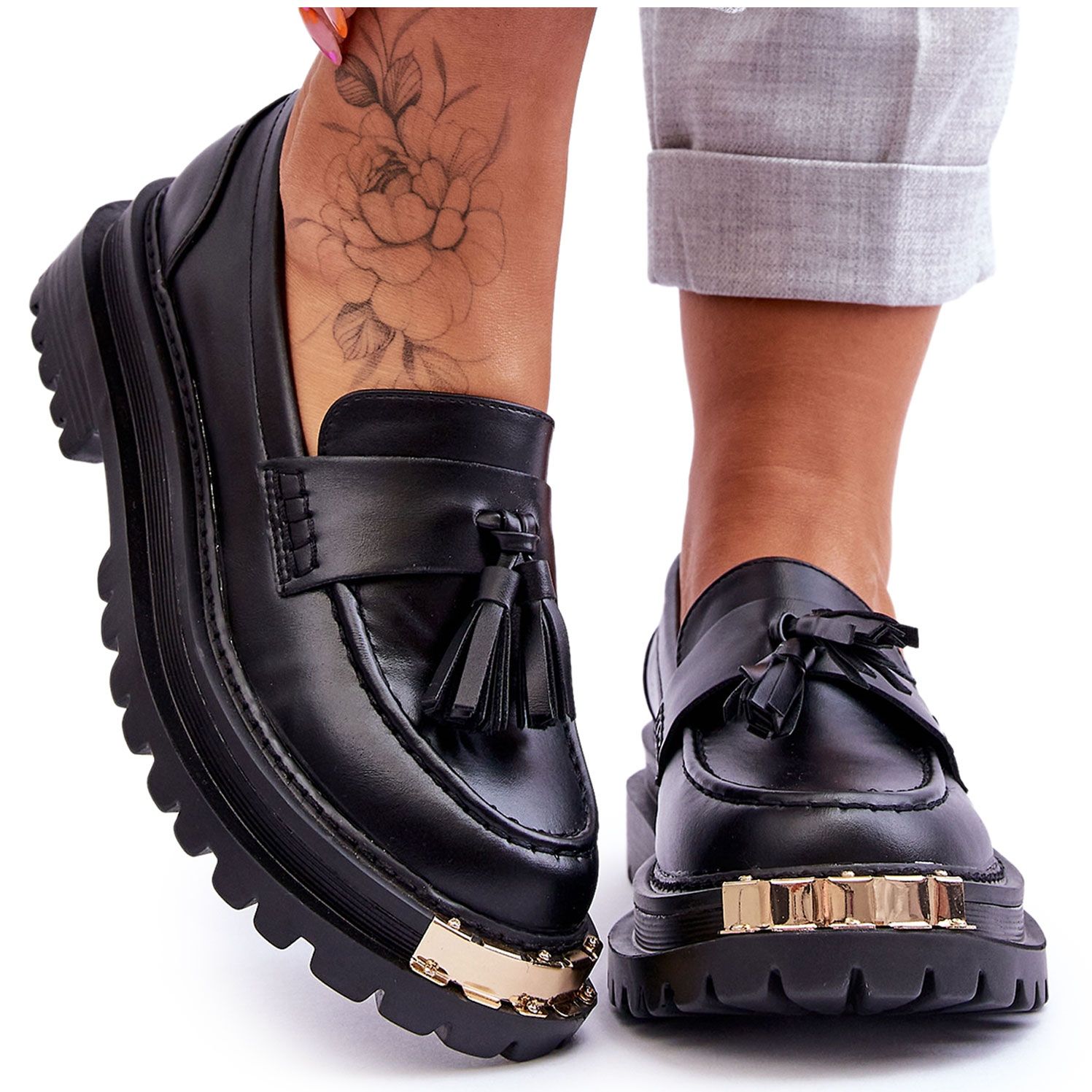 Elegantni, crni natičnici izrađeni od ekološke kože prijedlog su koji kombinira udobnost s modernim detaljima. Na prednjoj strani nalazi se suptilan, zlatni ukras, a u sredini gornjih elegantnih ruba koji dodaju karakter i lakoću. Model je postavljen na stabilnoj platformi visokom 4,5 cm s ravnom petom, što osigurava udobnost nošenja cijeli dan.