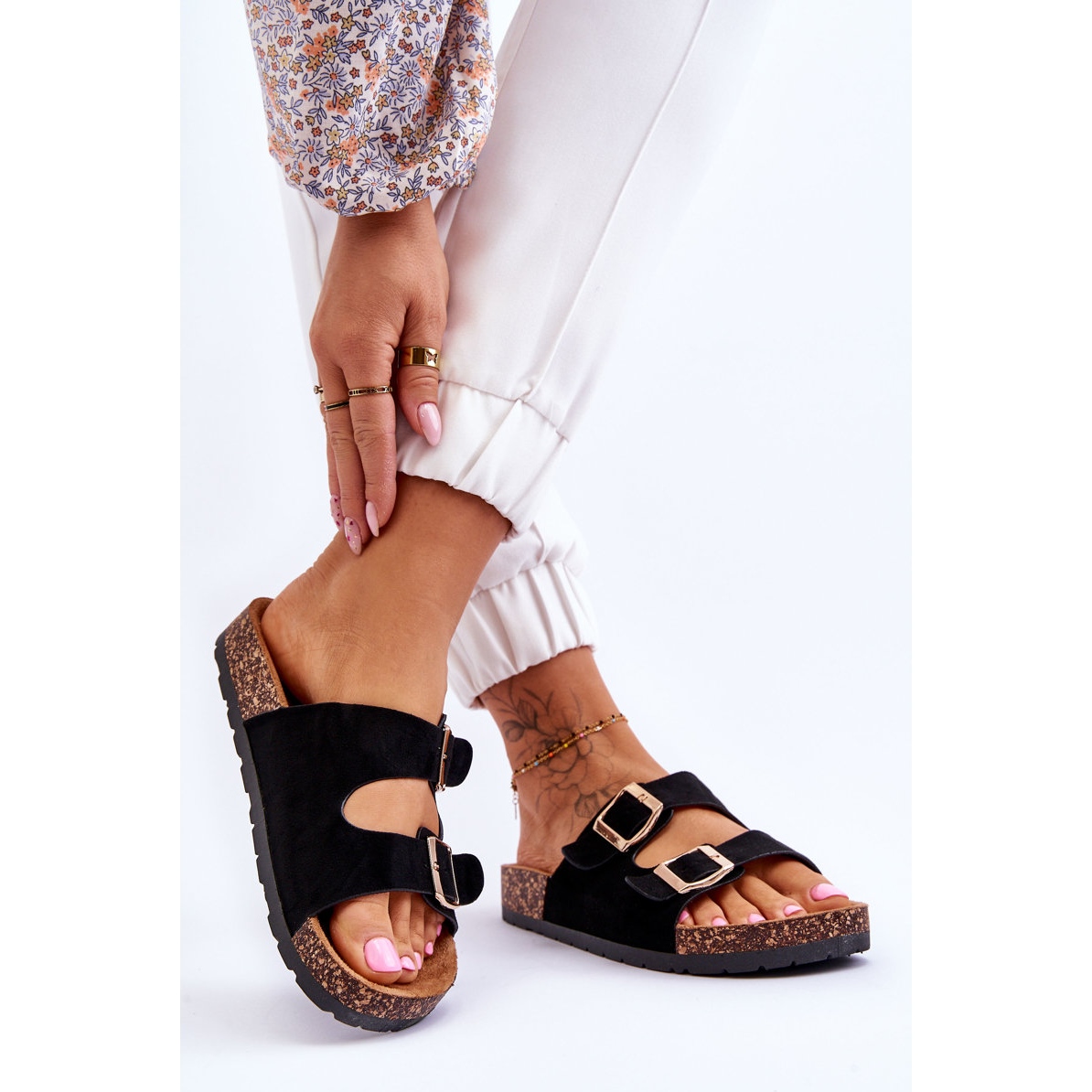 Ženski klizanje -u papučima Cortina - stil i praktičnost svaki dan. Savršeno za ljetne šetnje i kupovinu: Dvije široke, podesive pruge pričvršćene kopčama omogućuju vam da uskladite širinu stopalu, a profilirani umetak iz ekološke antilop osigurava mekoću i udobnost tijekom dana. Lagana, 3 cm platforma s izgledom pluta dodaje stabilnost, dok se brine o odmaranju nogu.