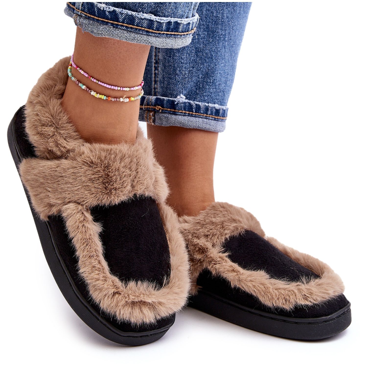 Elegantna crna boja i dodatni naglasak bež krzna čine ove papuče savršenom dopunom vašoj kućnoj odjeći. Štoviše, elegantna završna obrada od eko antilop kože čini da se ovaj model ističe od ostalih proizvoda dostupnih na tržištu.