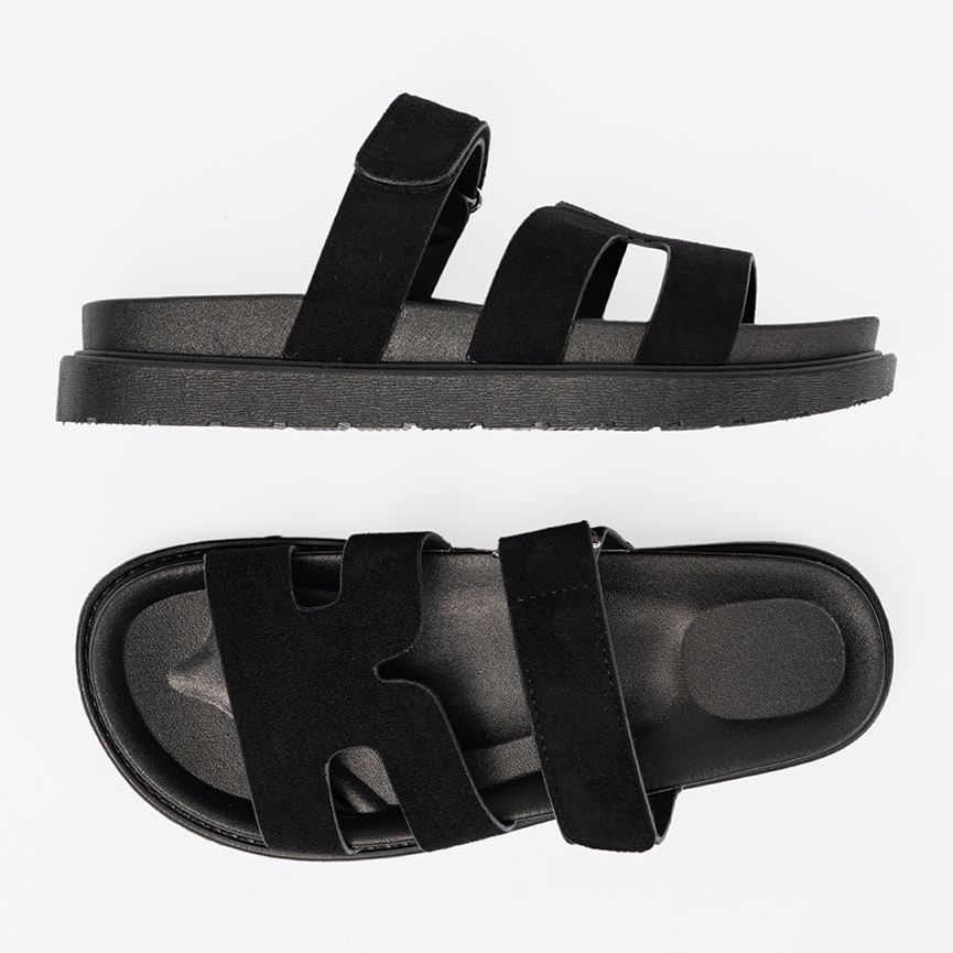Ovi flip flops imaju umetnutu kopču, što olakšava stavljanje i skidanje, a ekološki kožni umetak brine za udobnost stopala tijekom dana. U elegantnoj crnoj boji savršeno se uklapaju u trendove ležernog stila, savršeno podudarajući s raznim ljetnim stilizacijama.