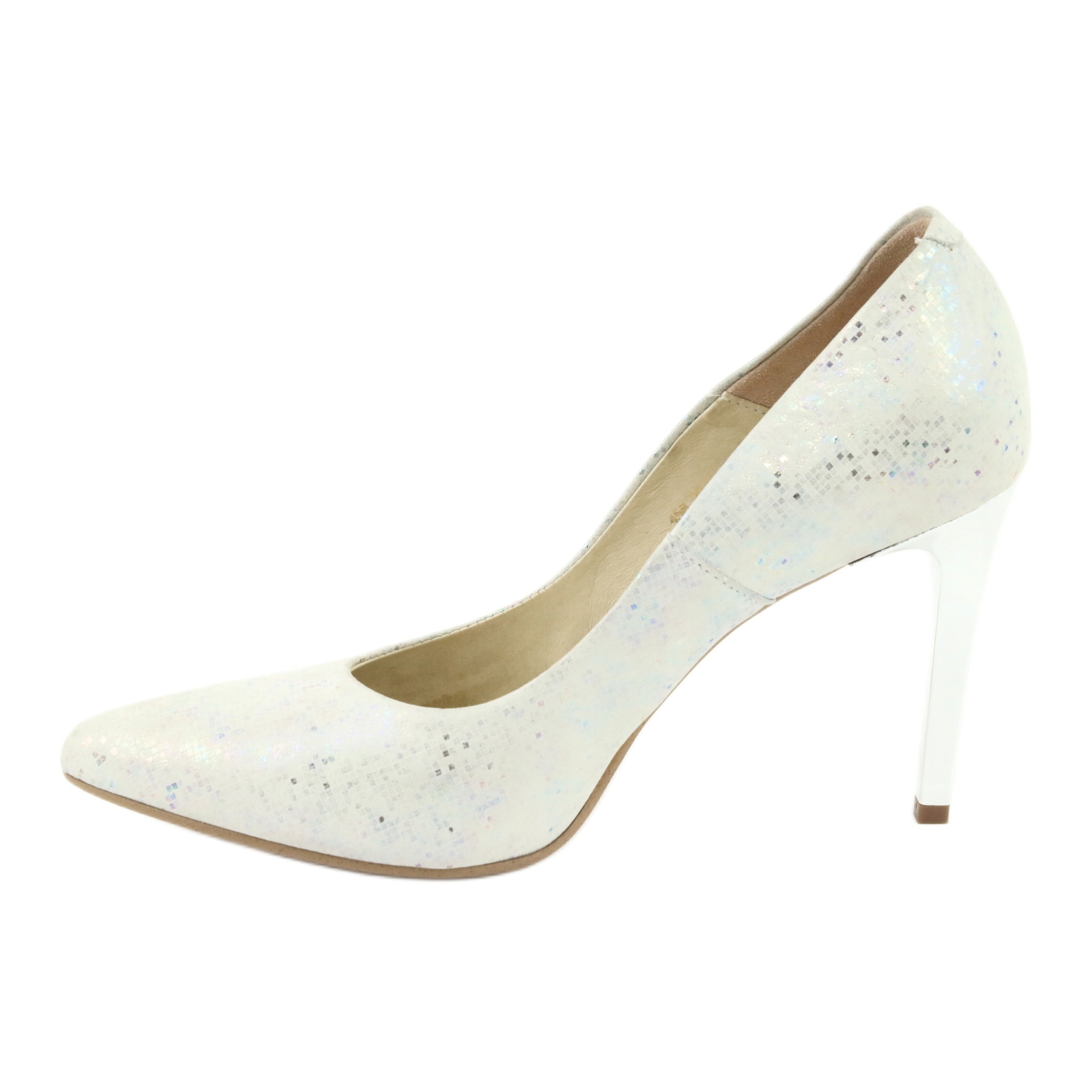 Ženske salonke Espinto 456/96 elegantan su izbor za svaku ženu koja želi spojiti modu i udobnost. Ove jedinstvene bijele biserne salonke, ukrašene nježno svjetlucavim gležnjevom, zasigurno će privući pozornost. Upotreba metalik srebrne potpetice visine 8,5 cm daje cipelama jedinstven karakter, savršeno pristajući uz mnoge večernje stilove i posebne prilike, poput vjenčanja.
