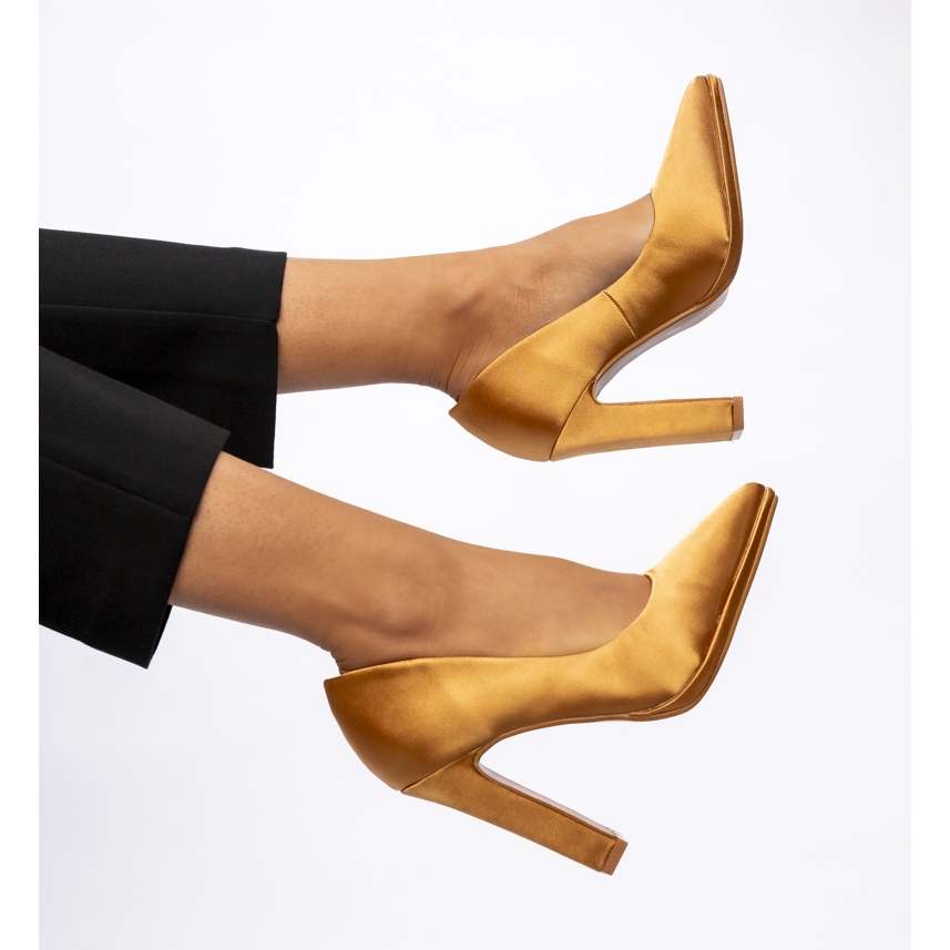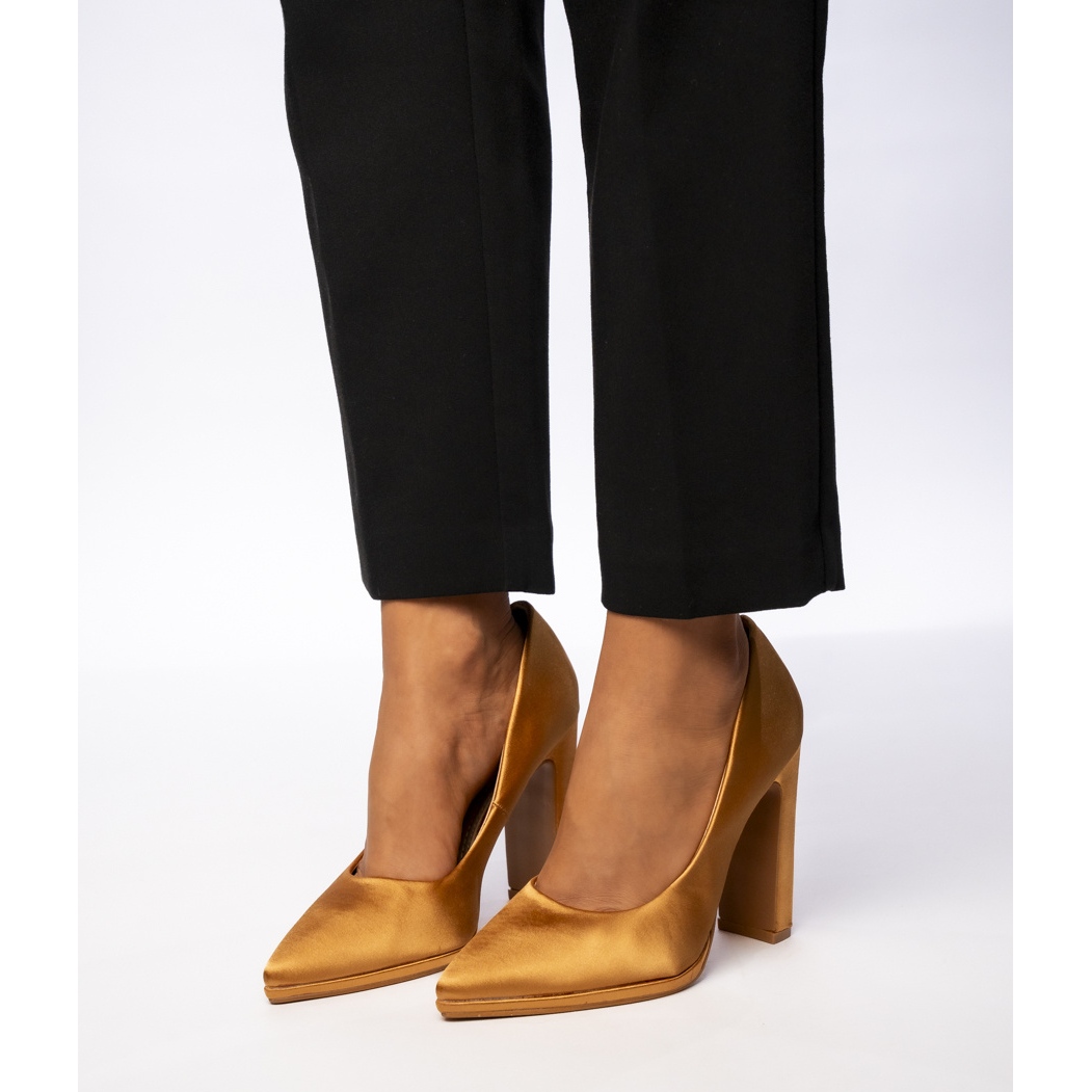 Topla nijansa kamile i suptilni satenski završetak daju ovim pumpama jedinstven karakter koji upada u oko i dovršava svako elegantno stvaranje. Visoki post ne samo da je mršav figura, već i osigurava udobnost nošenja cijeli dan, što ih čini savršenim izborom za duge sate na poslu ili na zabavama.
