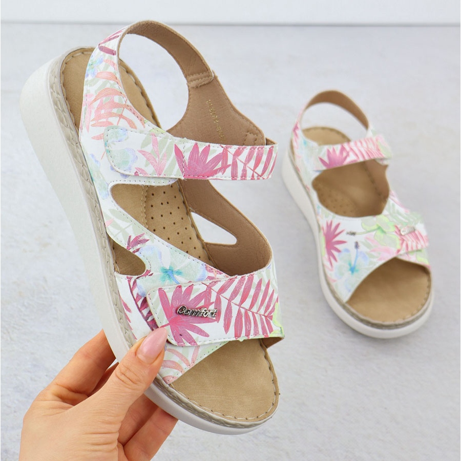 Cvjetni uzorak na bijeloj pozadini daje im lakoću i svježinu, a debljina potplata od 2 cm i visina klina 4 cm osigurava udobnost dugim satima. Izrađene od ekološke kože, sandale nisu samo estetske, već i ekološki prihvatljive. Mekani ekološki kožni umetnik brine se o udobnosti stopala, a pričvršćivač čičak olakšava stavljanje i prilagođavanje individualnim potrebama.