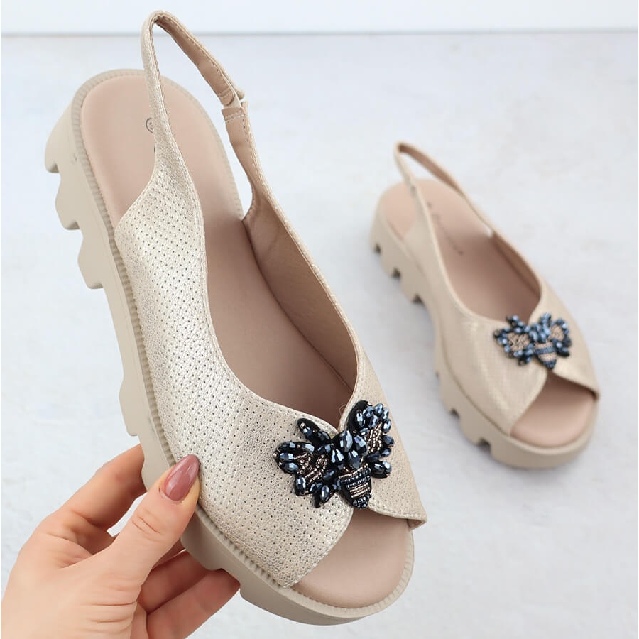 Sandale su opremljene mekim uloškom i fleksibilnim potplatom, što svaki korak čini zadovoljstvom. Debljina platforme od 3,5 cm dodaje stil i stil, a istovremeno jamči stabilnost. Zahvaljujući uzorcima otvorenih radnika i suptilnim cirkonima, ovaj model privlači oko i postaje sjajan dodatak ljetnim stilizacijama.