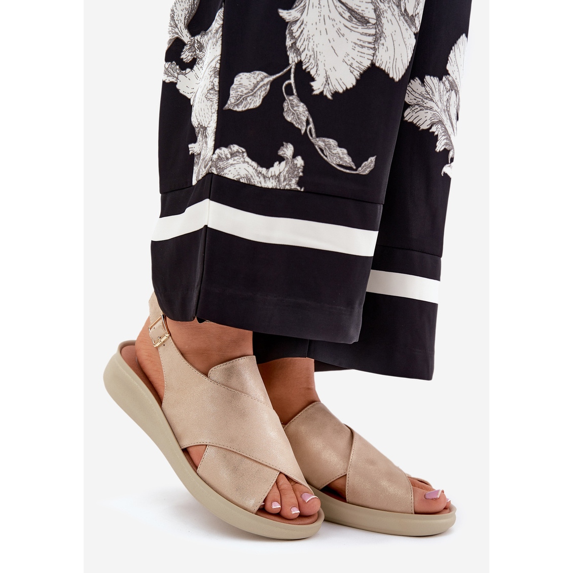 Zlatne jezzi sandale u zlatnoj boji odličan su izbor za ljetne dane koji kombiniraju eleganciju i udobnost. Izrađene od eko kože visoke kvalitete, oni ne samo da pružaju elegantan izgled, već i udobnost nošenja. Postavljeni na osjetljivi klin s visinom od 4 cm, jamče stabilnost prilikom hodanja, što ih čini idealnim pratiteljem i u šetnji i tijekom glavnih izlaza.