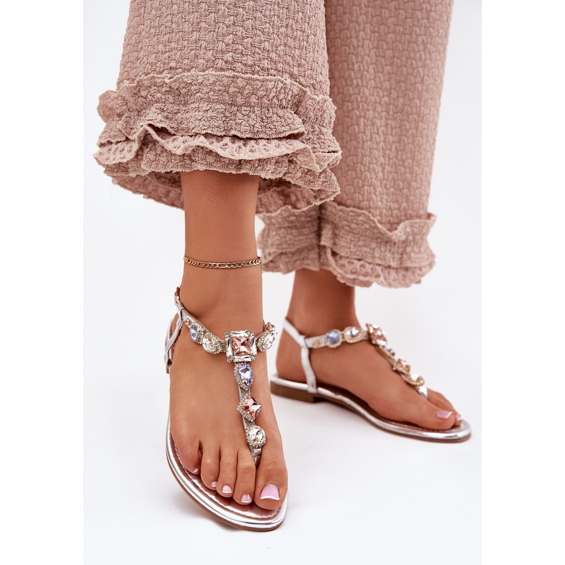Ovaj model karakterizira ravna peta s visinom od 1,5 cm, što osigurava udobnost nošenja cijeli dan, bez obzira na prigodu. Zahvaljujući kopči, sandale mogu lako uskladiti vaše stopalo, što povećava udobnost i stabilnost pri hodanju. Dekorativni kristali daju im sjaj i malo elegancije, učinkovito hvatajući oko.