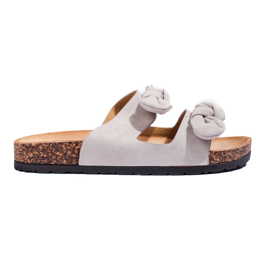 Vanjski materijal izrađen od ekološke antilop kože dodaje suptilnost i eleganciju, a njihova otvorena peta i nedostatak nosa čine ih savršenim izborom u toplim danima. Siva boja uvodi elegantan naglasak koji savršeno ide s povremenim stilizacijama. Osim toga, flip flops ukrašen je šarmantnim lukom, što im daje jedinstveni karakter.