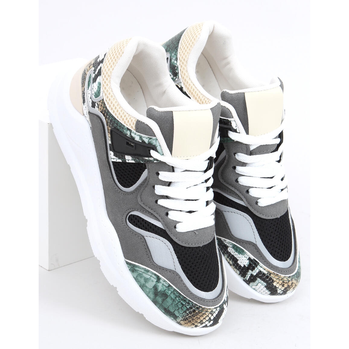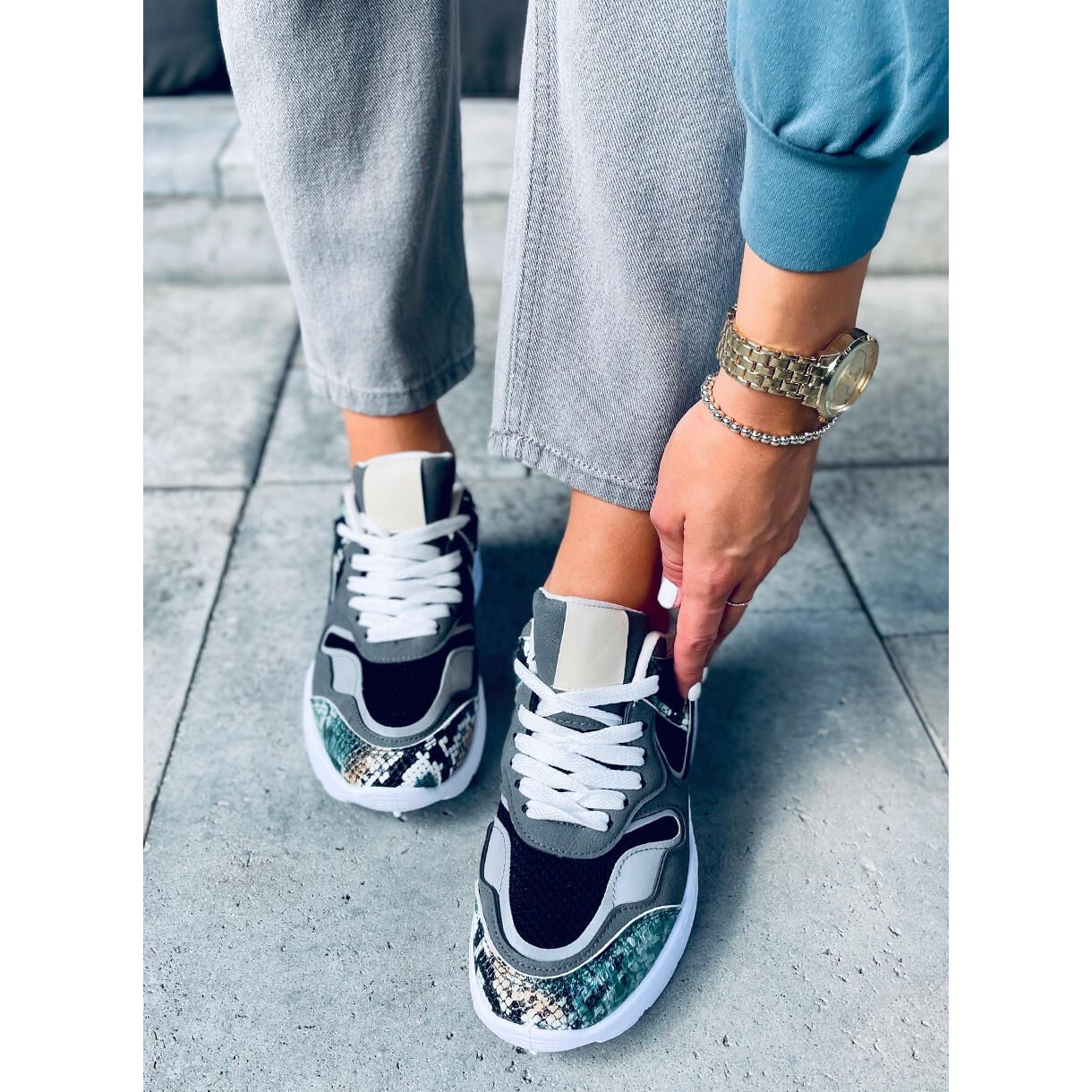 Ovaj model impresionira ne samo svojim jedinstvenim dizajnom, već i visokom kvalitetom izrade. Privlačni umeci s motivom zmijske kože i mrežasti elementi učinit će svaki korak modnim izričajem. Unutrašnjost cipela podstavljena je mekom tkaninom koja povećava udobnost korištenja, a ravni potplat visine 3 cm savršen je za duge šetnje ili intenzivan trening.
