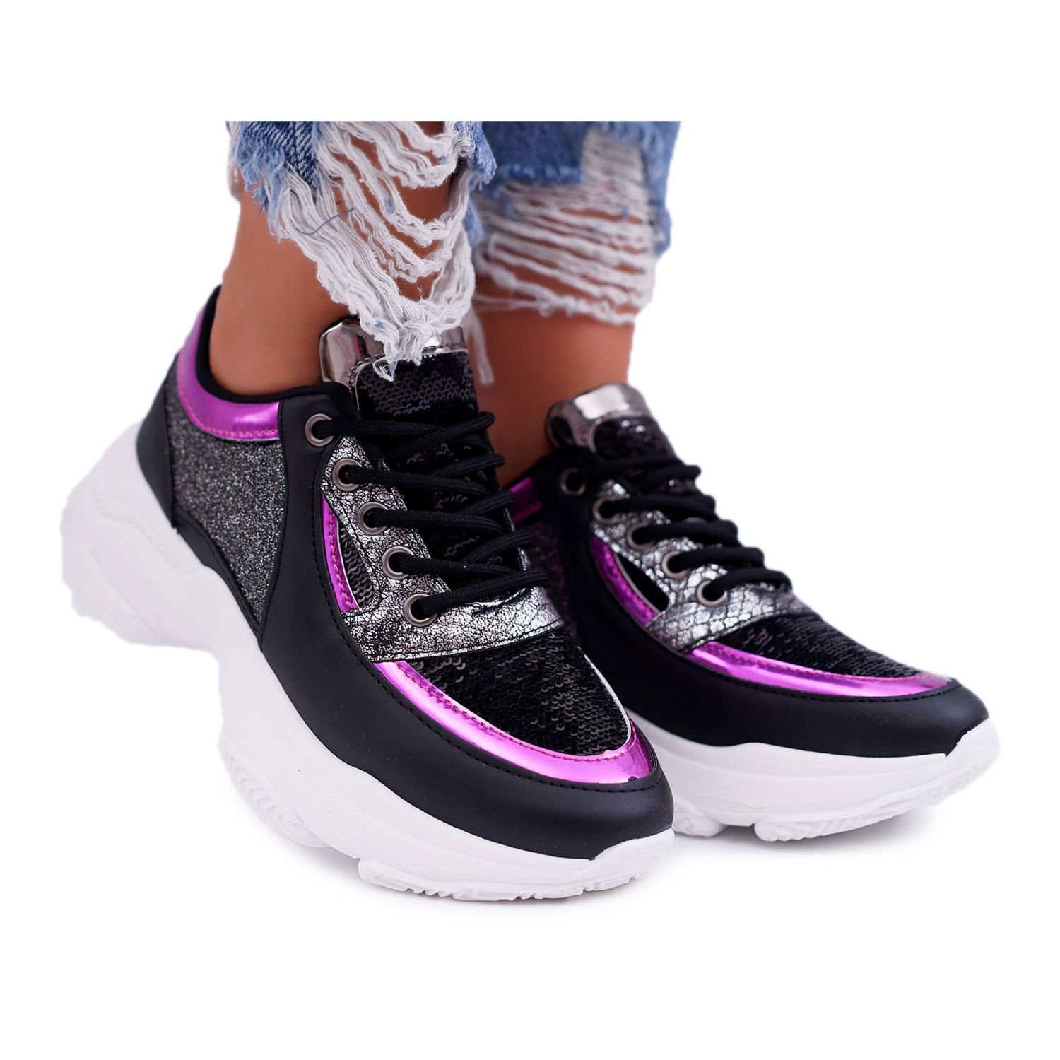 Ženska sportska obuća s debelim potplatom Glitter Black Ranea siva savršen je izbor za žene koje cijene originalan stil i svakodnevnu udobnost. Karakterizira ih jedinstveni dizajn koji spaja moderan, sportski kroj i upečatljive svjetlucave umetke. Zahvaljujući debelom potplatu visokom 5 cm, ove cipele ne samo da dodaju pravu količinu visine, već pružaju i udobnost pri svakom koraku.