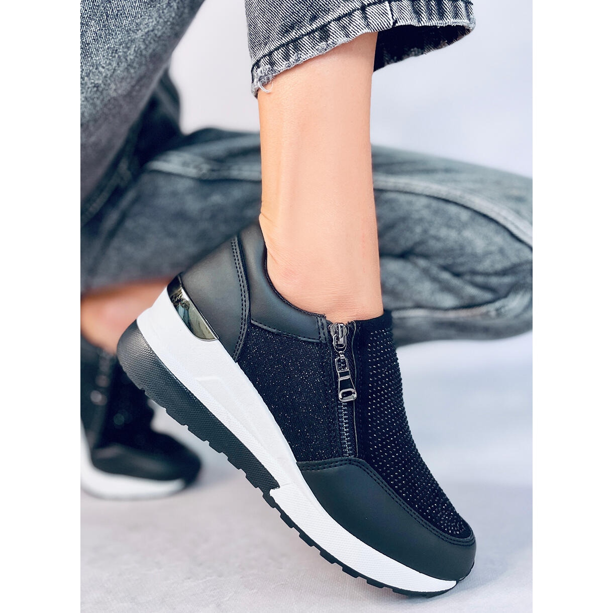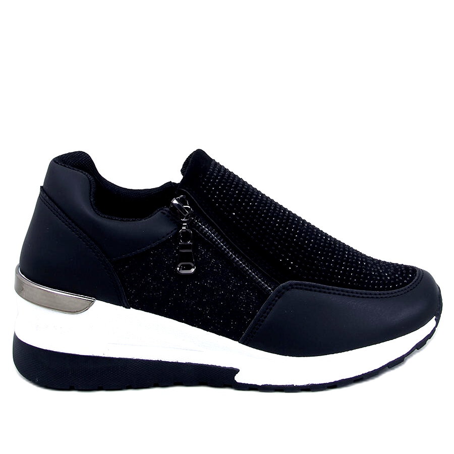 Elegantne i udobne ženske klinove (6 cm) tenisice koje kombiniraju sportsku udobnost sa ženskim sjajem. Model je izrađen od ekološke kože i tkanine, s sjajnim završetkom i prednjem dijelom s cirkonima - privlači izgled i dodaje stil svakodnevnim stilizacijama. ZIP učvršćivač osigurava brzo i ugodno umetanje, a okrugli nos i mekani umetak od tkanine brinu o udobnosti tijekom dana.