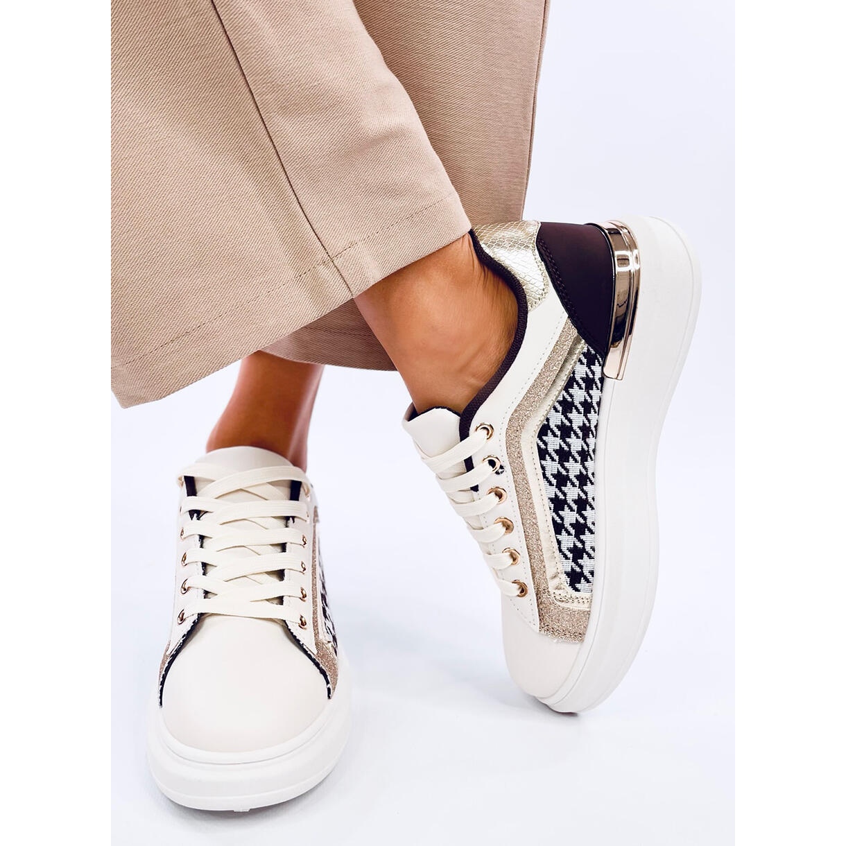Otkrijte najnoviji hit sezone - ženske tenisice Volyne u boji BEŽ/KAVA. Ove sportske cipele na vezanje s visokim potplatom spajaju klasičan kroj s najmodernijim uzorkom koji će zasigurno privući pažnju. Houndstooth uzorak u kombinaciji sa svjetlucavim i metalnim umetcima svakoj ženi koja ih nosi daje samopouzdanje i osjećaj za trendove.